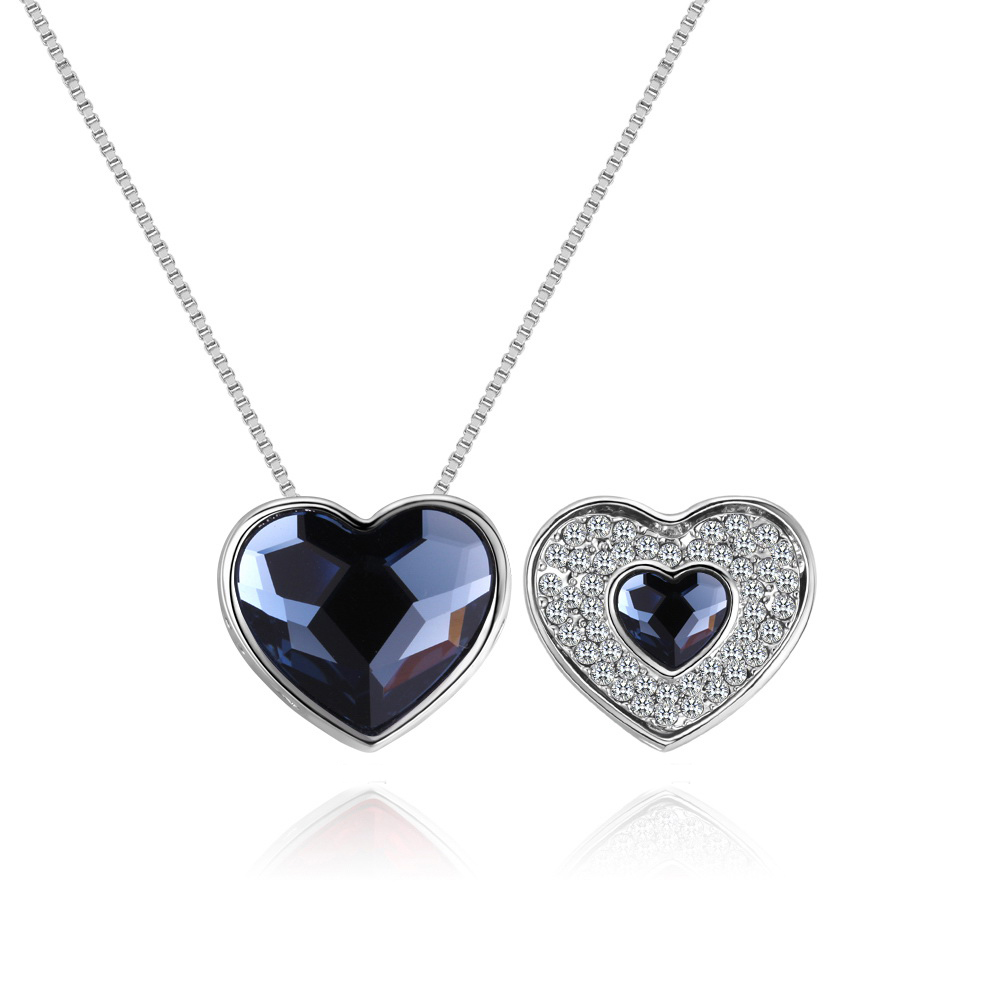 Dije con cadena en baño de oro blanco de 18 quilates, diseño de corazón con doble vista cuenta con incrustación de cristales en color blanco y azul.