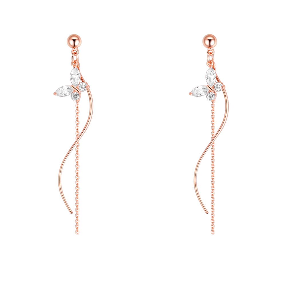 Aretes en baño de oro rosa de 18 quilates, diseño de mariposa, con incrustaciones de cristales color blanco.