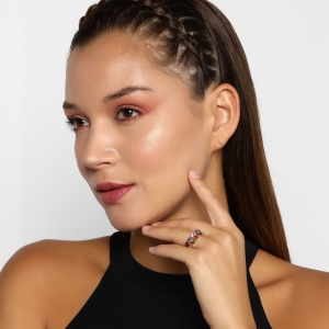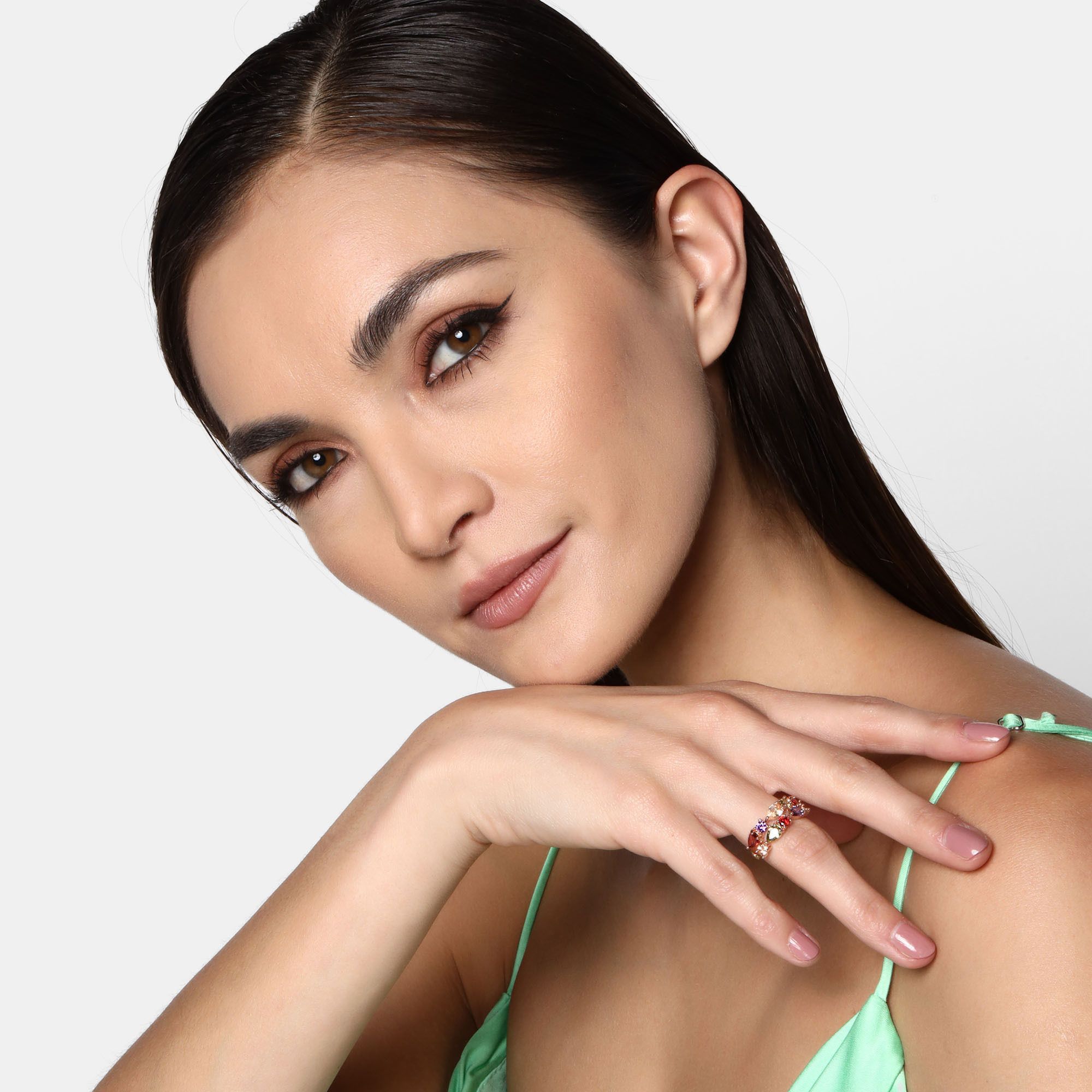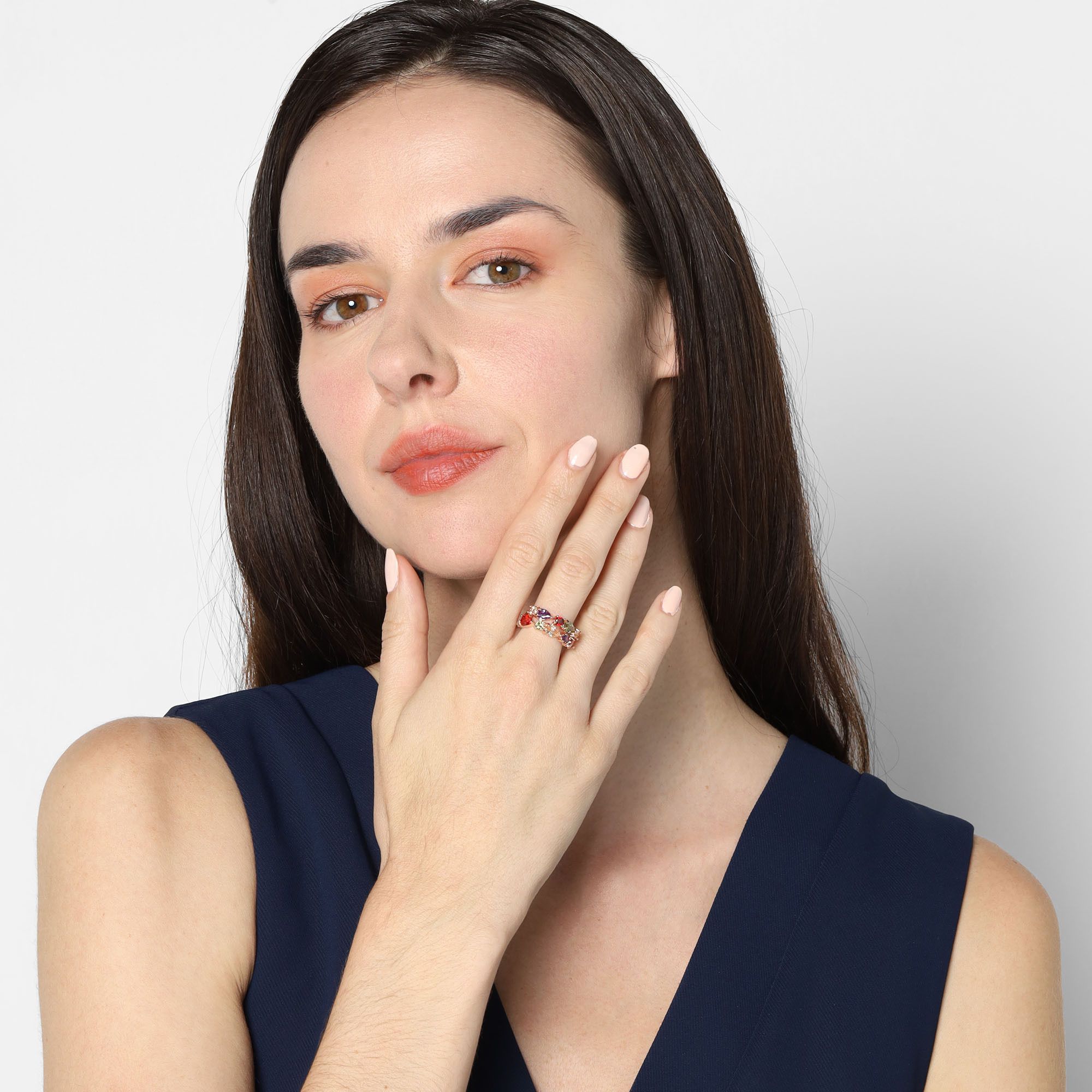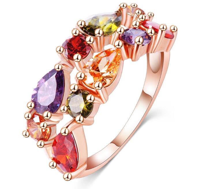 Anillo en baño de oro rosa de 18 quilates, fino diseño, con cristales corte pera, multicolor.