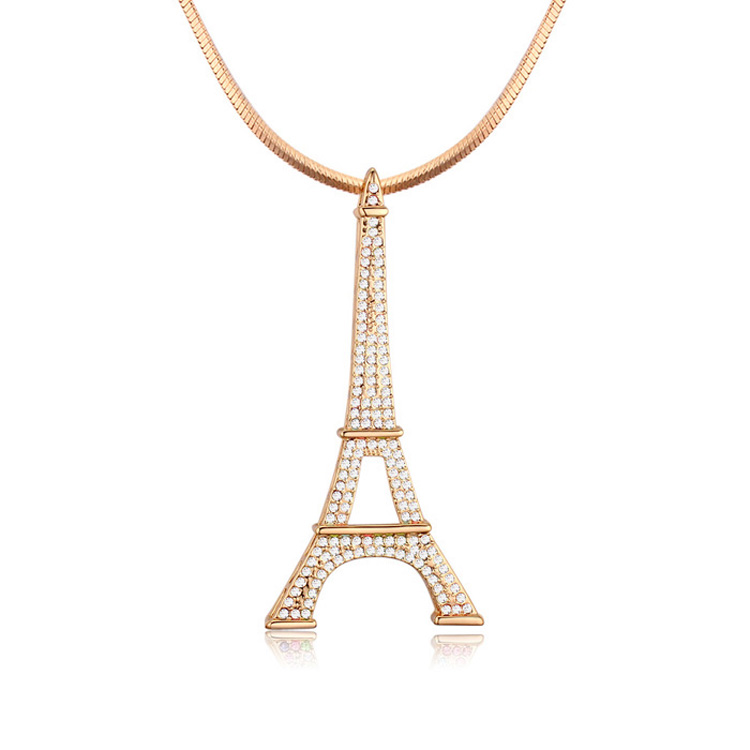 Collar para sweater en baño de oro amarillo de 18 quilates, diseño de la torre Eiffel con incrustaciones de cristales blancos.