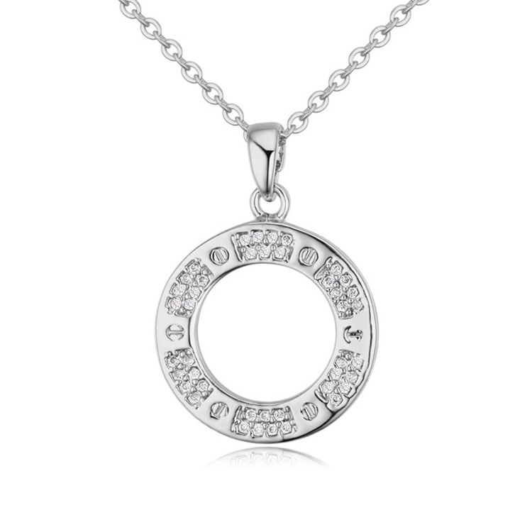 Dije con cadena en baño de oro blanco de 18 quilates, diseño de círculo con incrustaciones de cristales en color blanco. Fabricado en una estructura de aleación de platino con rodio sin níquel