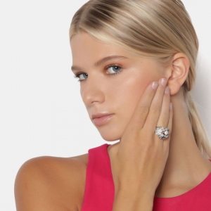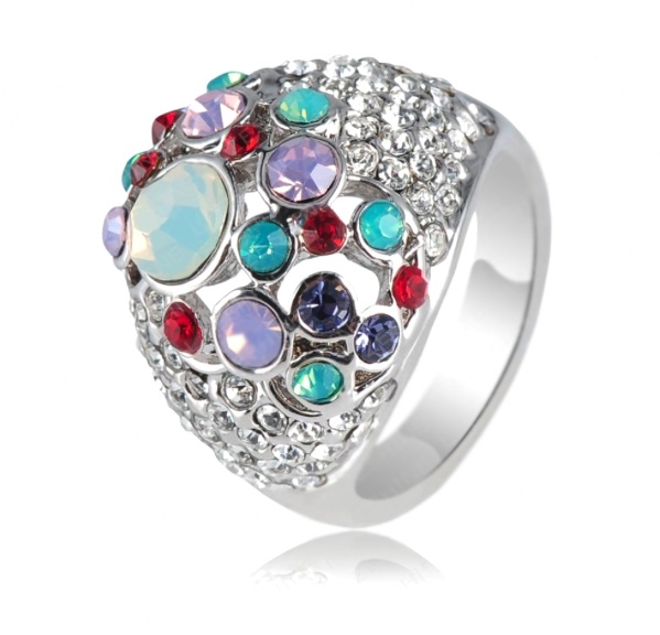 Hermoso anillo en baño de oro blanco de 18 quilates, diseño convexo, con incrustaciones de cristales de colores ópalo, aqua, morado, rojo, y blancos.