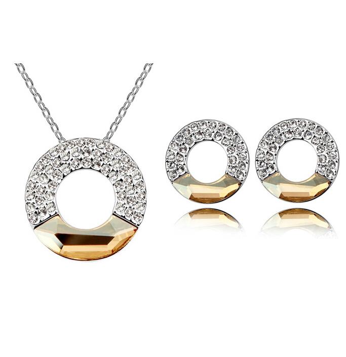 Juego de aretes y dije en baño de oro blanco de 18 quilates, diseño de círculos con incrustación de cristales en color ámbar y blanco.