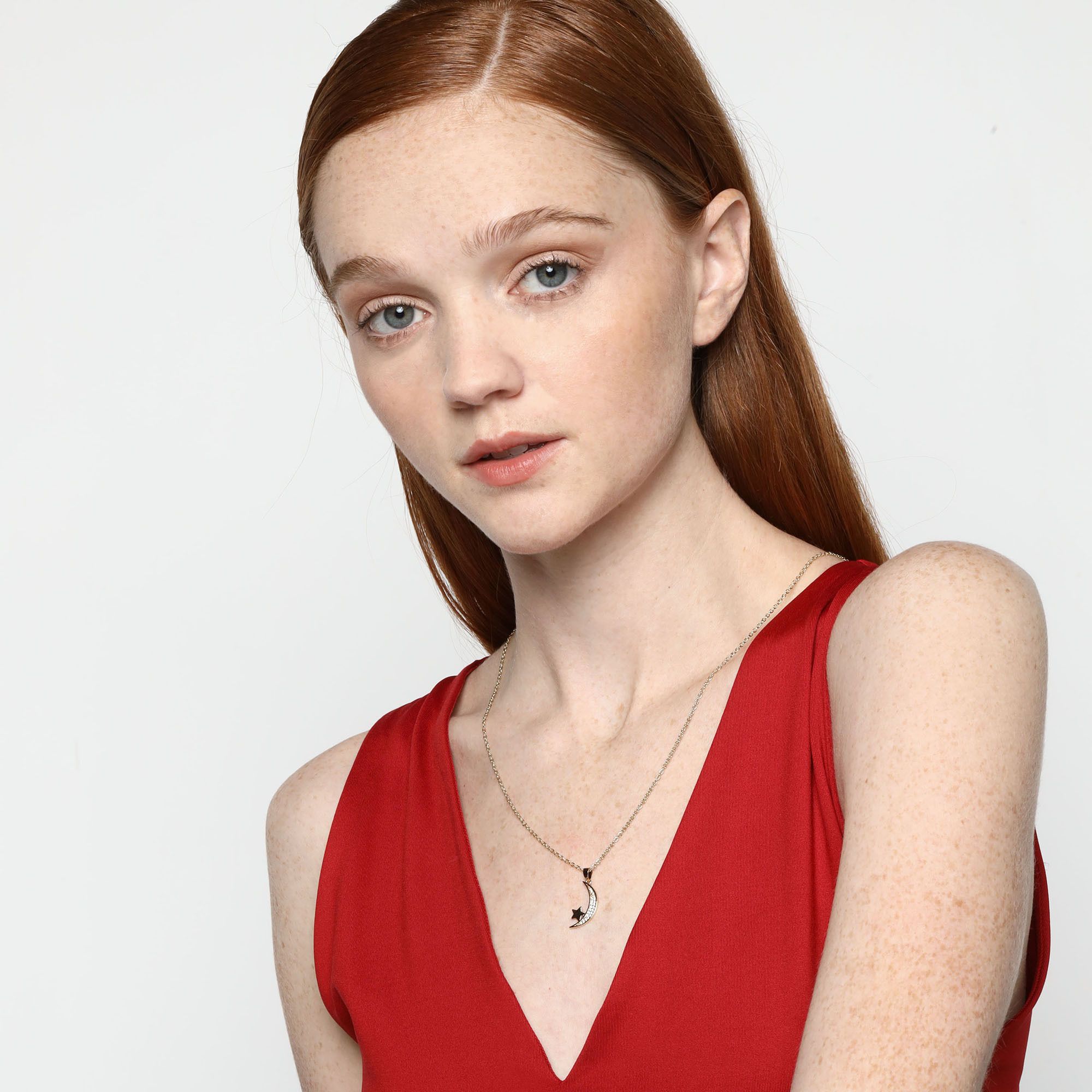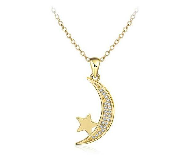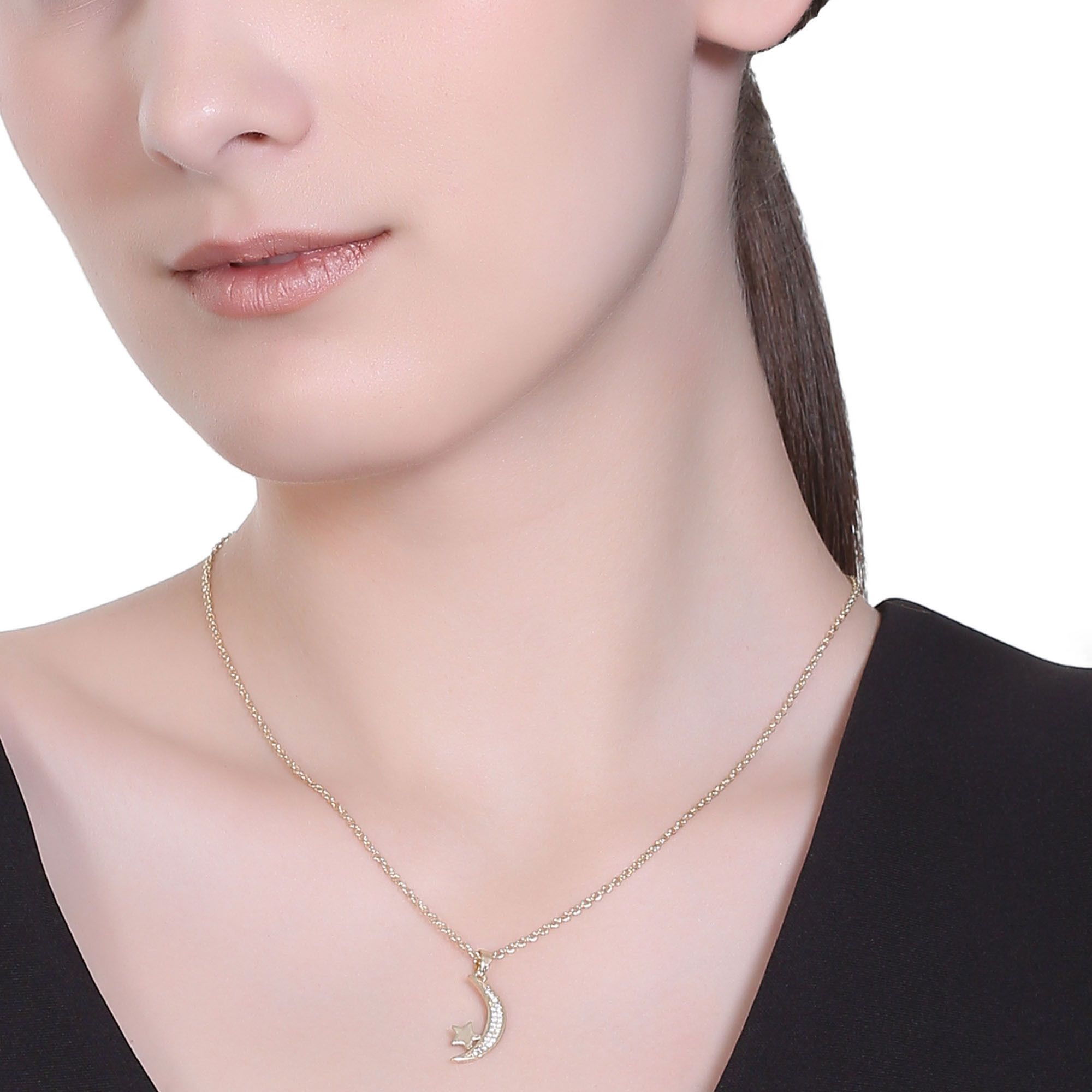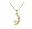 Dije con cadena en ba�o de oro amarillo de 18 quilates, dise�o de luna y estrella, con incrustaciones de cristales blancos.