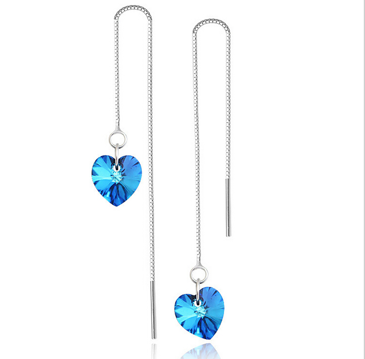 Lindos pendientes en baño de oro blanco de 18 quilates, diseño de corazón de cristal en color azul.