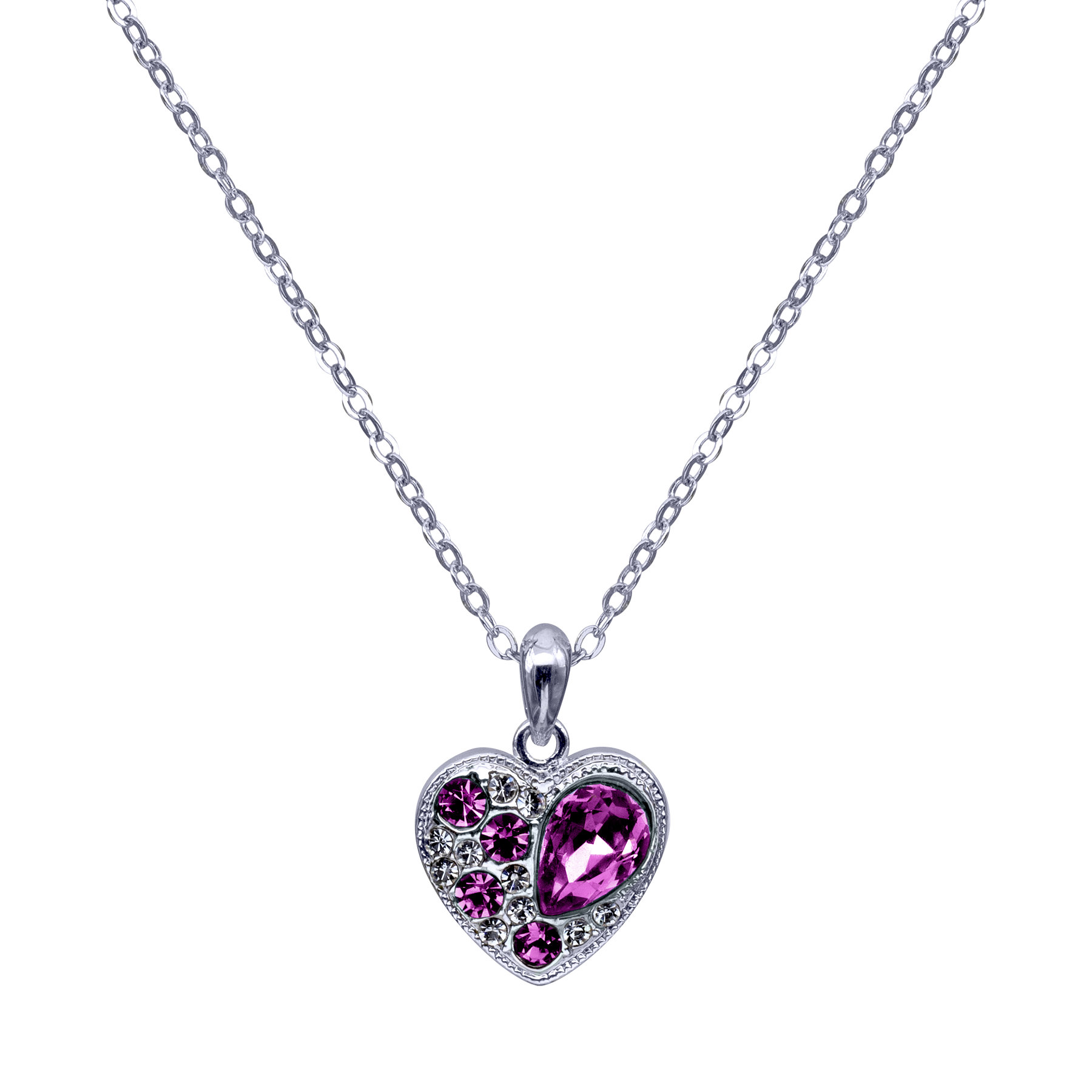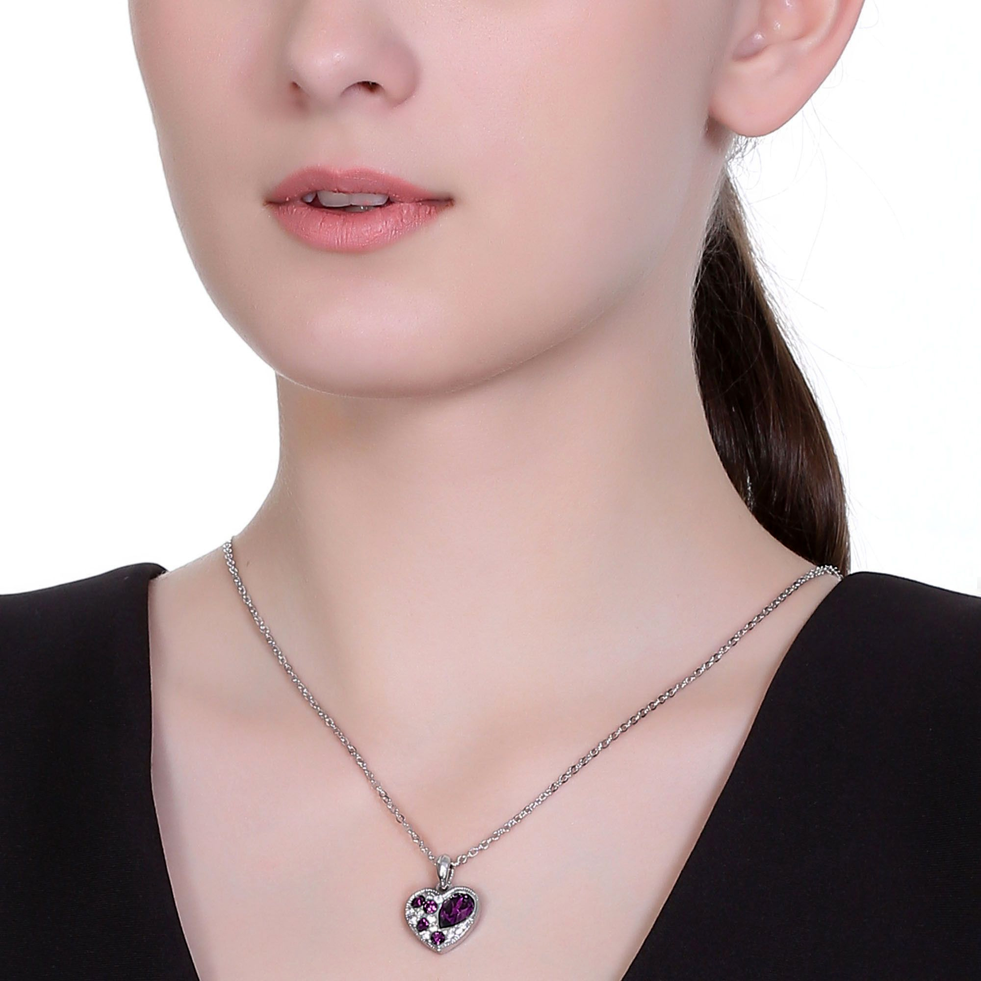 Dije con cadena en baño de oro blanco de 18 quilates, diseño de corazón con incrustaciones de cristales en color morado fabricado en una estructura de aleación de platino con rodio sin níquel.