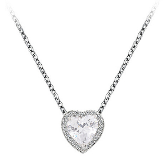 Dije con cadena en baño de oro blanco de 18 quilates, fino diseño de corazón con incrustación de cristales en color blanco.