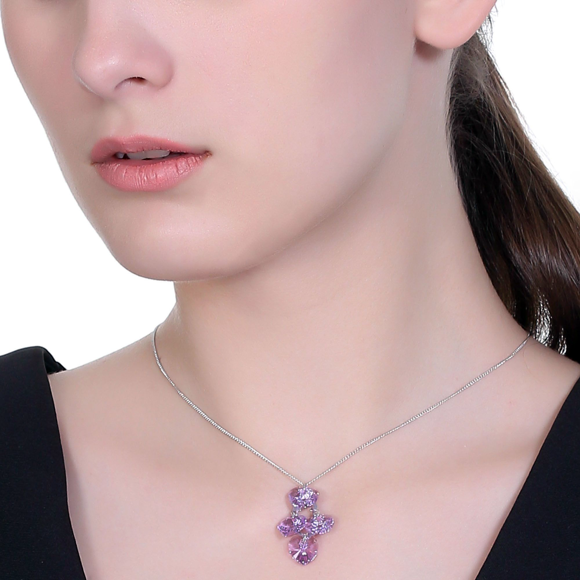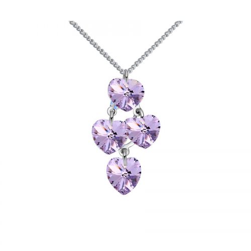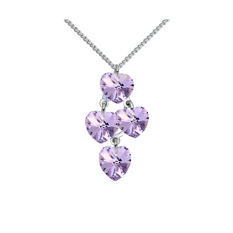 Dije con cadena en baño de oro blanco de 18 quilates, Hermoso diseño con corazónes de cristales en color lila. Fabricado en una estructura de aleación de platino con rodio sin níquel 1. joyería Hipoalergénica. 2. Incluye cajita de joyería. 3. Garantía de 30 días por defectos de fabrica.