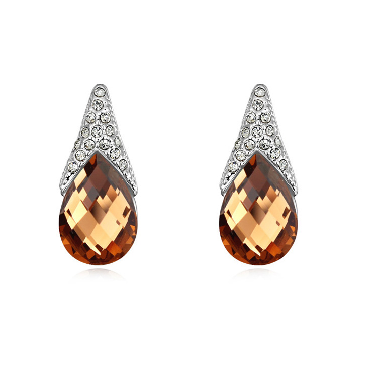 Elegantes Aretes en baño de oro blanco de 18 quilates, diseño de gota, con cristal ámbar corte pera e incrustaciones de cristales blancos.