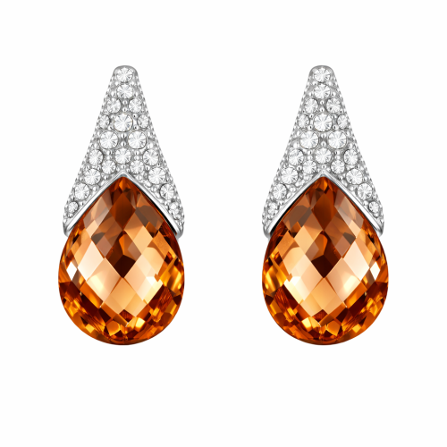 Elegantes Aretes en baño de oro blanco de 18 quilates, diseño de gota, con cristal ámbar corte pera e incrustaciones de cristales blancos.