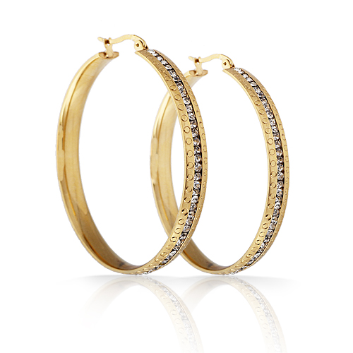 Preciosas arracadas en baño de oro amarillo de 18 quilates, elegante diseño con incrustaciones de cristales en color blanco.
