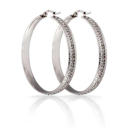 Preciosas arracadas en baño de oro blanco de 18 quilates, elegante diseño, con detalles en relieve e incrustaciones de cristales en color blanco.