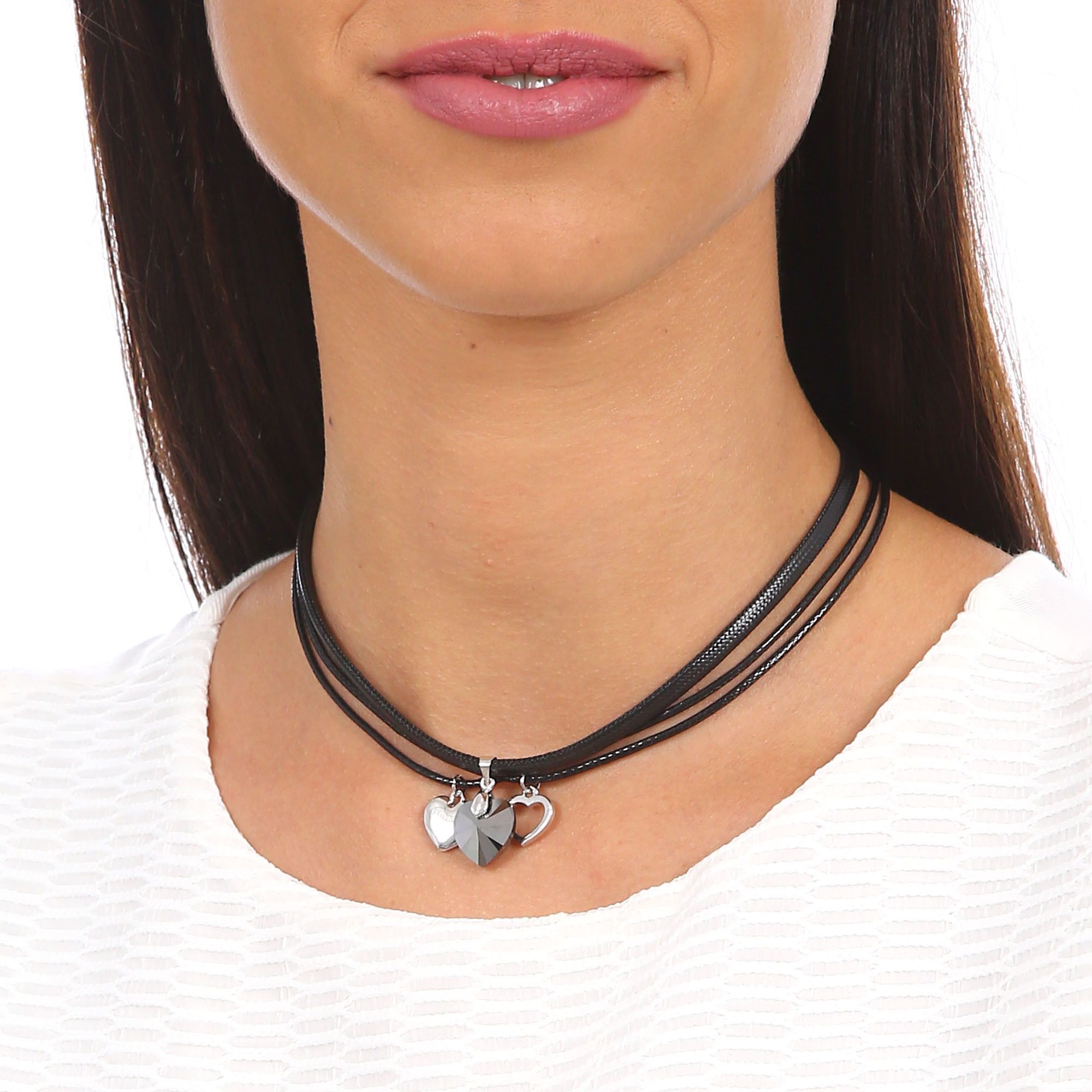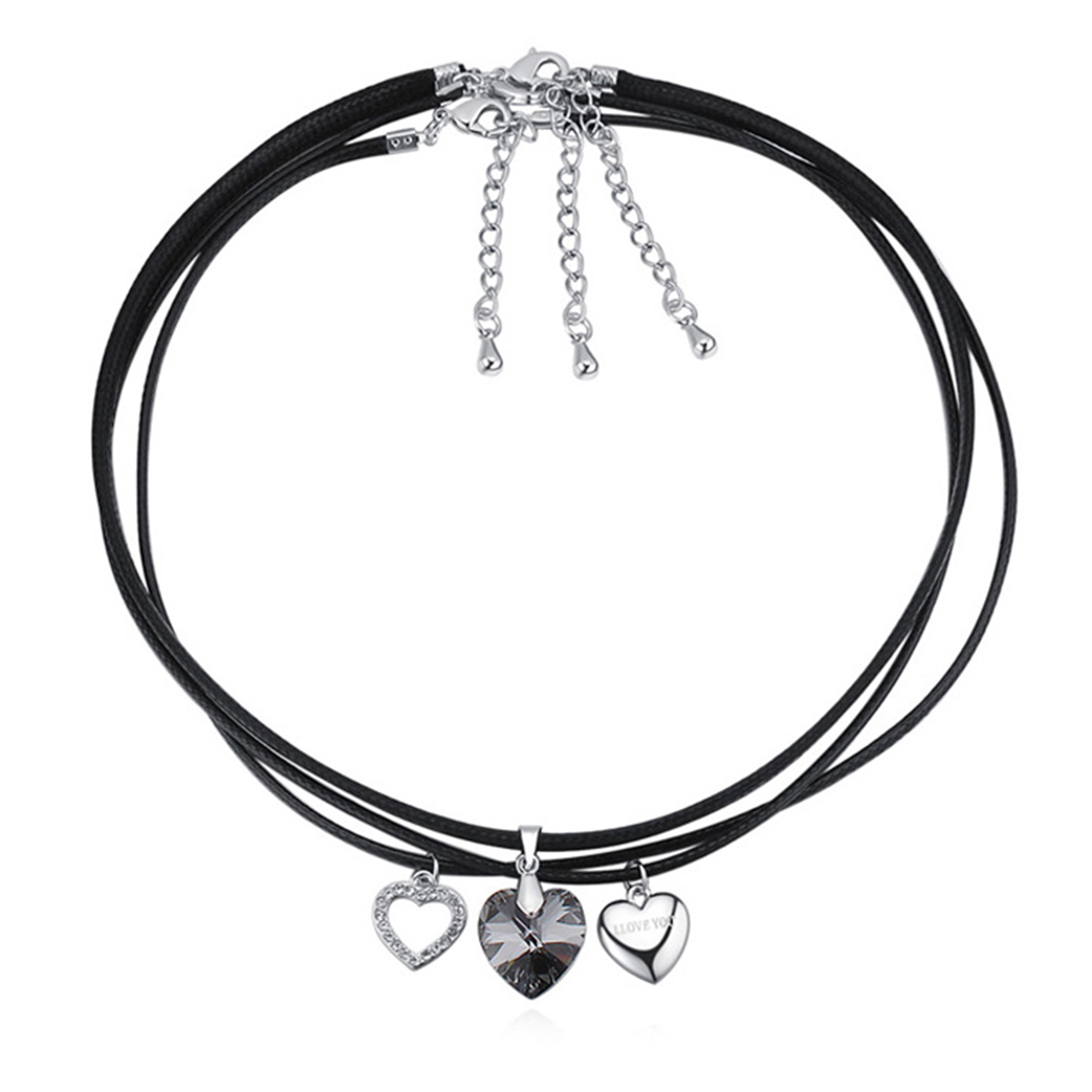 Collar triple, lindo diseño con corazón de cristal oxford, corazones plateados, incrustaciones de cristales blancos, grabado con leyenda "I LOVE YOU" y correa de estilo cuero negro.