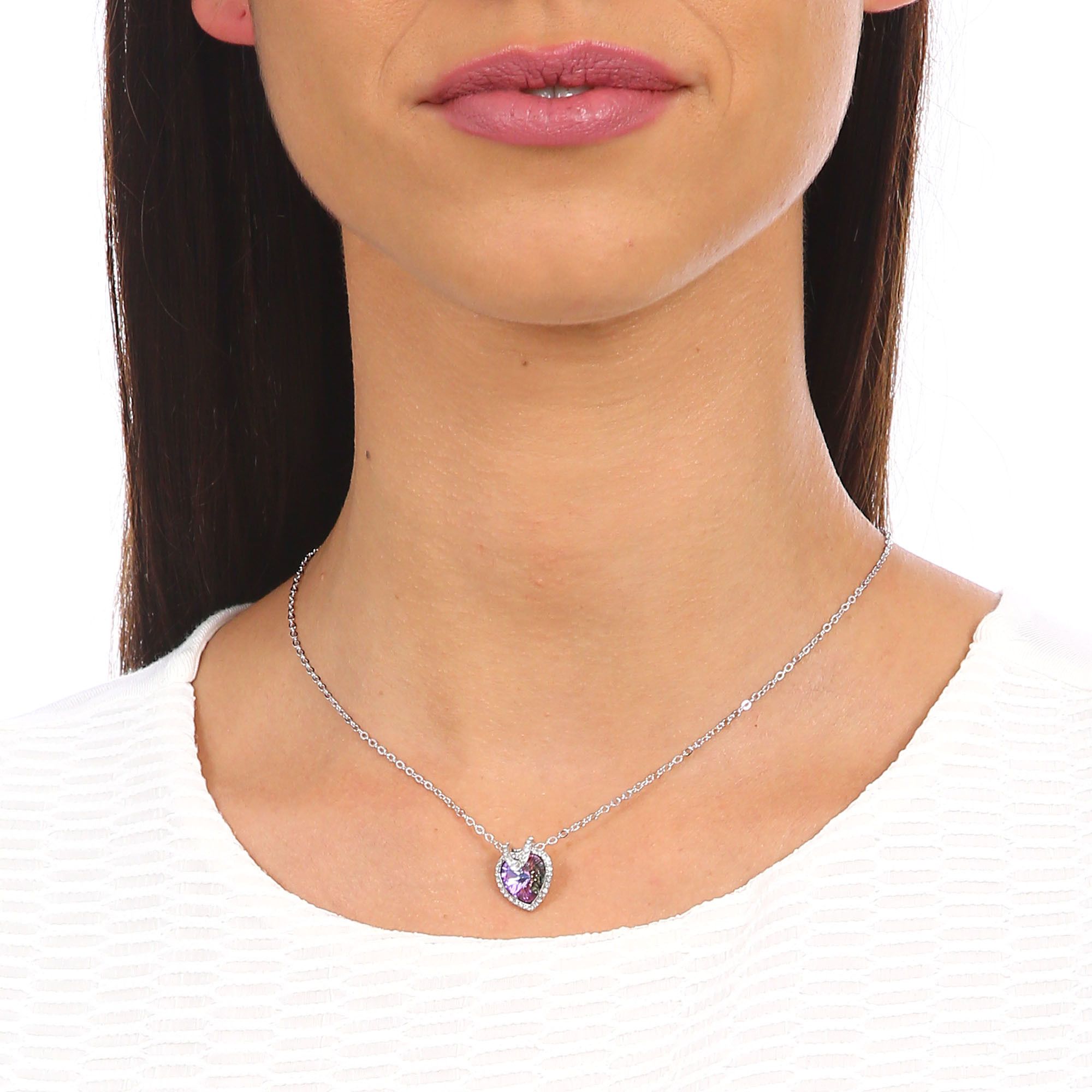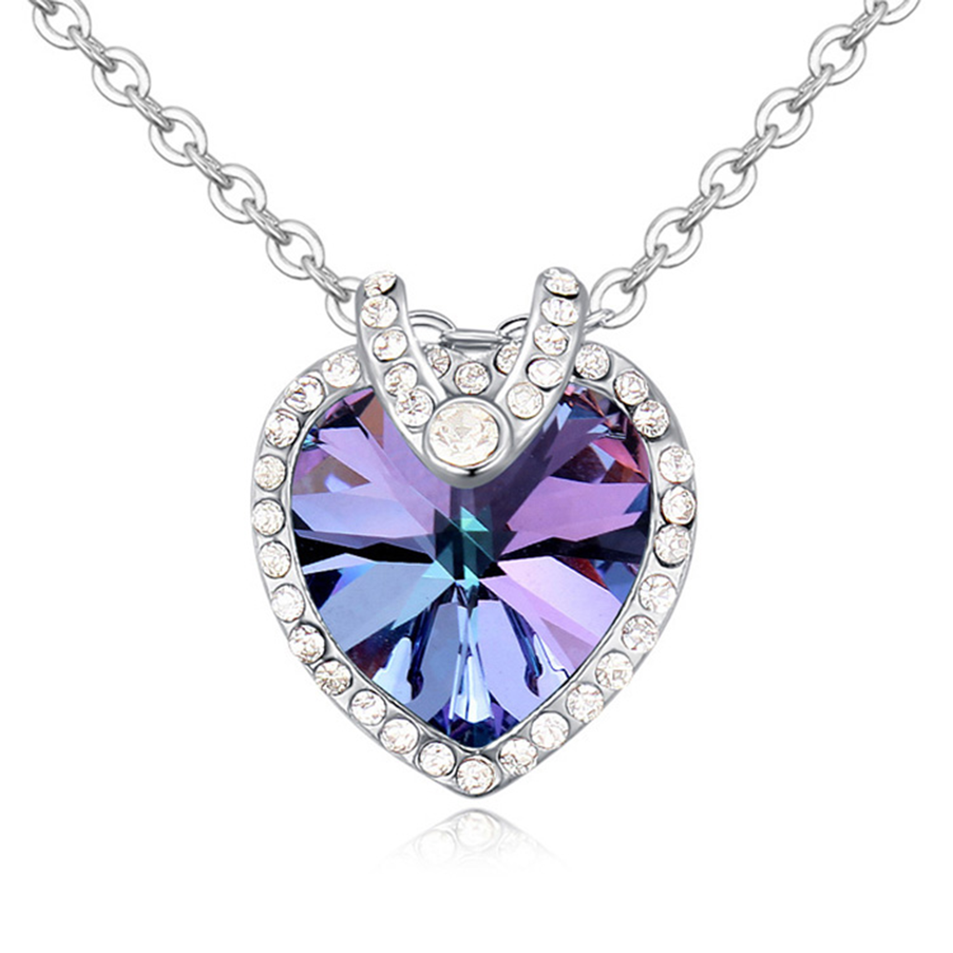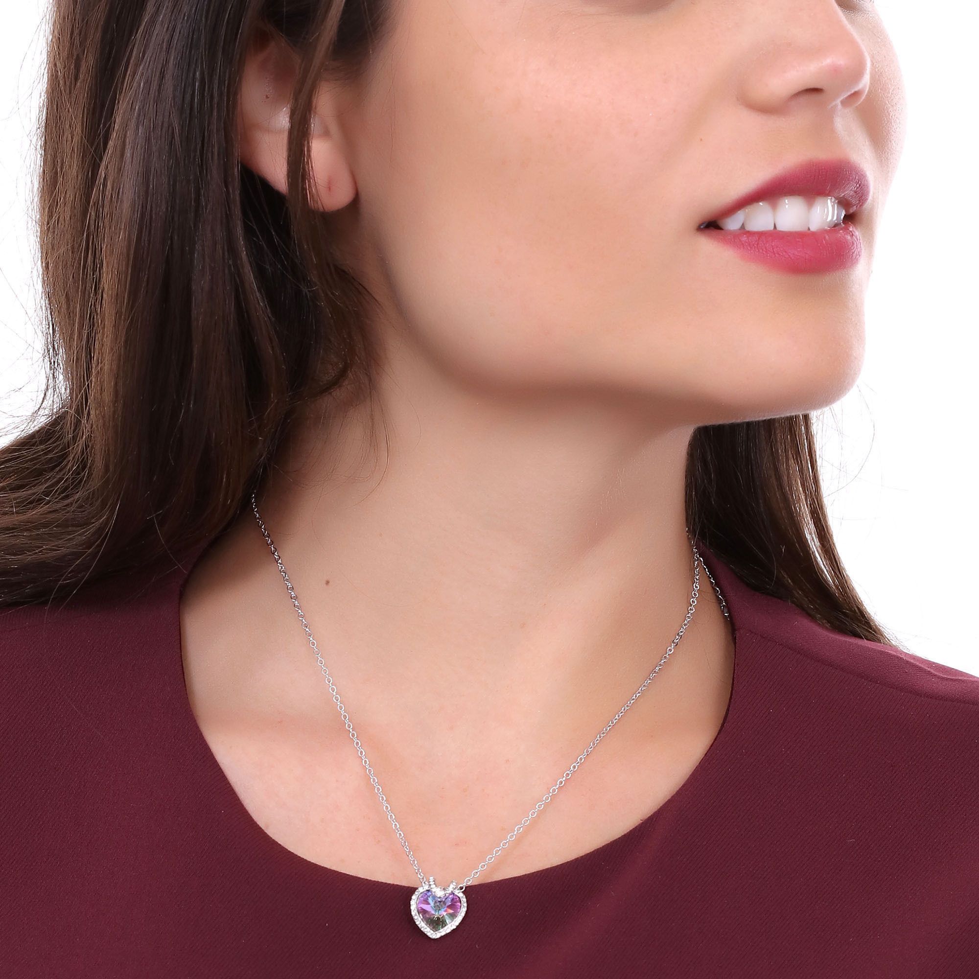 Dije con cadena en baño de oro blanco de 18 quilates, fino diseño de corazón con incrustación de cristales en color tornasol. Fabricado en una estructura de aleación de platino con rodio sin níquel. 1. joyería Hipoalergénica. 2. Incluye cajita de joyería. 3. Garantía de 30 días por defectos de fabrica.