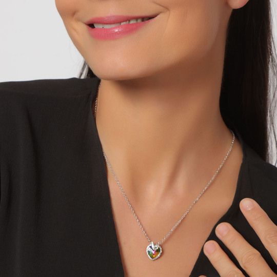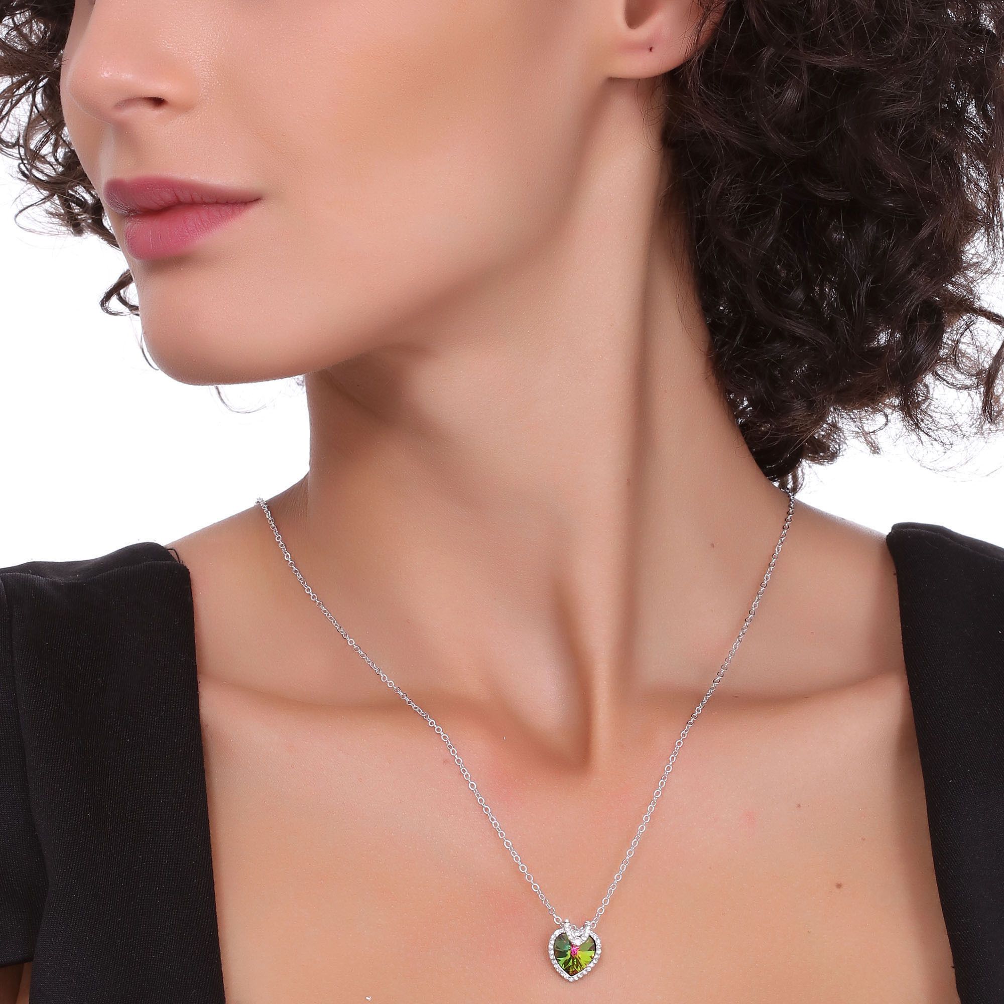 Dije con cadena en baño de oro blanco de 18 quilates, fino diseño de corazón con incrustación de cristales en color verde. Fabricado en una estructura de aleación de platino con rodio sin níquel. 1. joyería Hipoalergénica. 2. Incluye cajita de joyería. 3. Garantía de 30 días por defectos de fabrica.