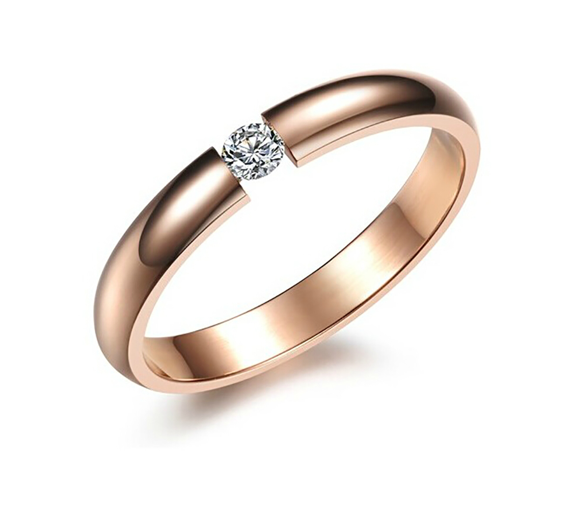 Delicado anillo en baño de oro rosa de 18 quilates, diseño convexo, con incrustación de cristal en color blanco corte brillante.