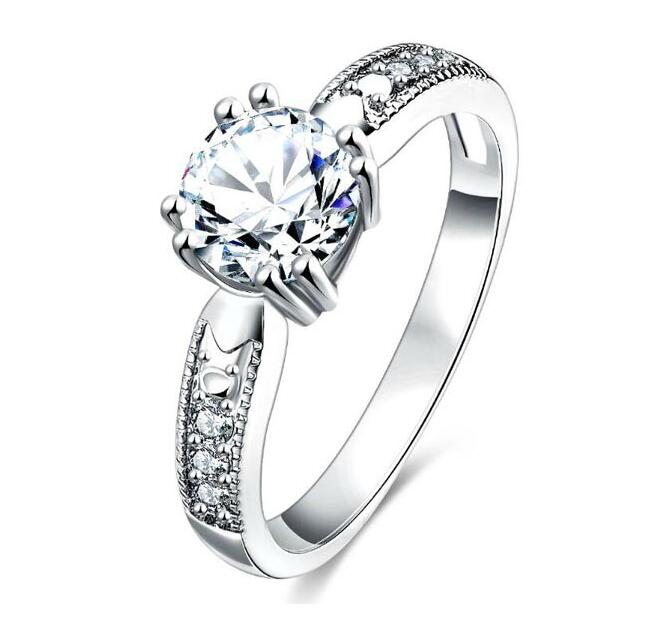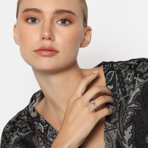 Anillo en baño de oro blanco de 18 quilates, fino diseño, con cristal blanco corte brillante e incrustación de cristales en color blanco.