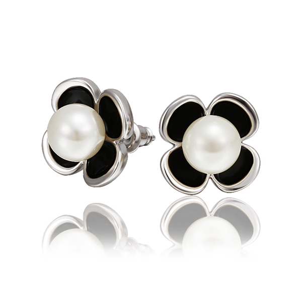 Bonitos aretes en baño de oro blanco de 18 quilates, diseño de flor con esmaltado negro y detalle de perla blanca.
