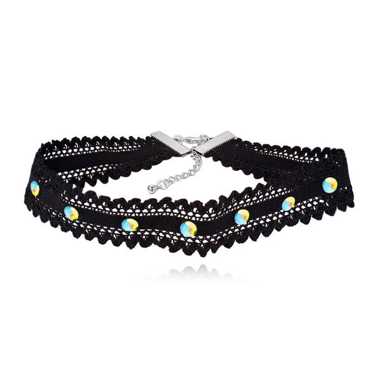 Gargantilla de encaje color negro, detalles en baño de oro blanco de 18 quilates y cristales tornasol.