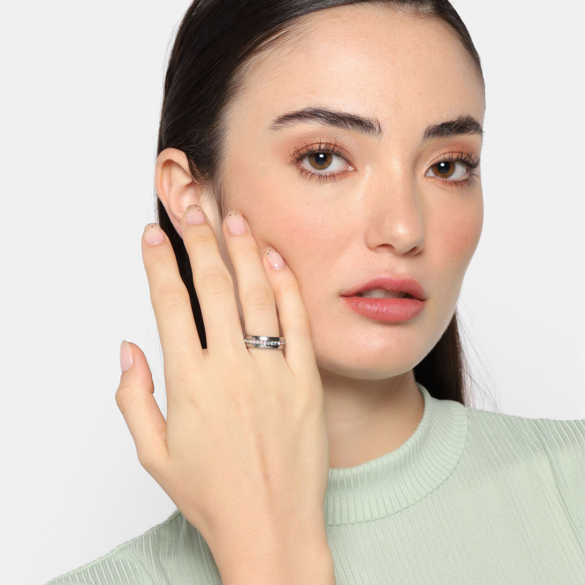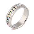 Anillo en acero inoxidable, elegante diseño biselado, con incrustaciones de cristales en color tornasol.