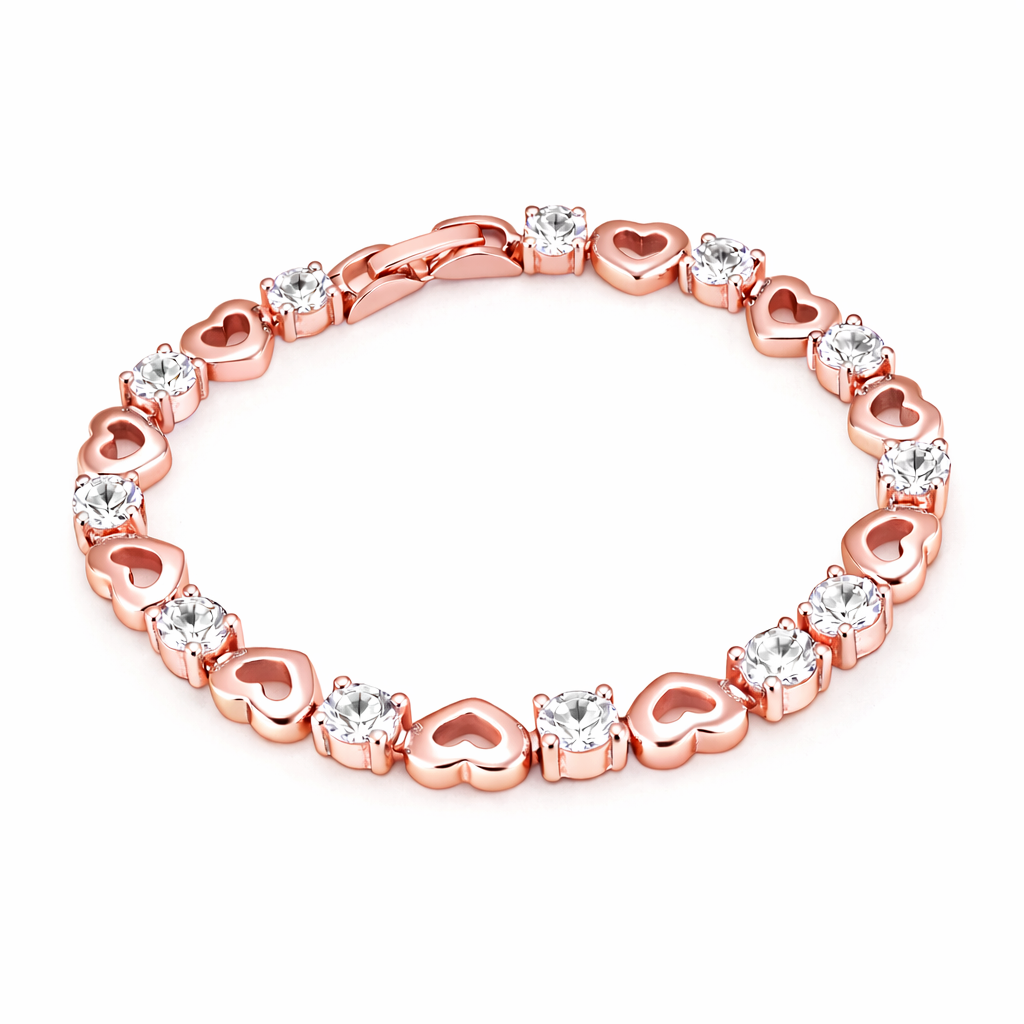 Elegante pulsera, en baño de oro rosa de 18 quilates, diseño de corazones, con incrustaciones de cristales en color blanco. Fabricado en una estructura de aleación de platino con rodio sin níquel.