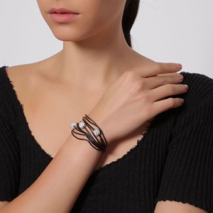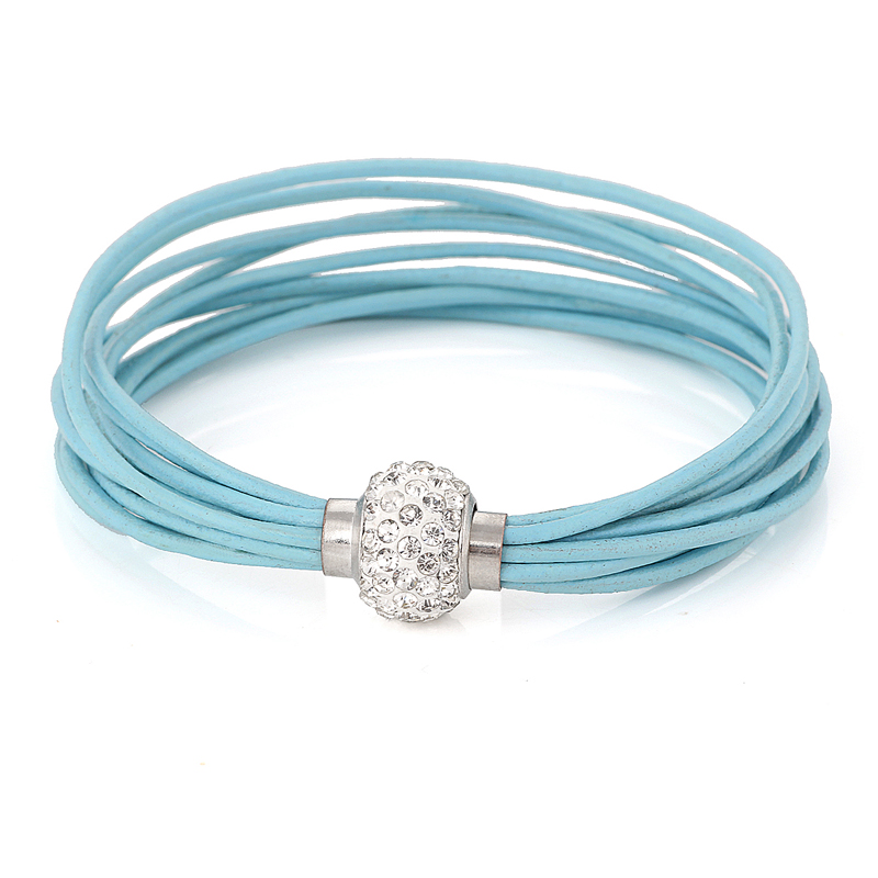 Pulsera de vinipiel, con correa múltiple en color azul, detalle de broche magnético, con incrustaciones de cristales en color blanco.
