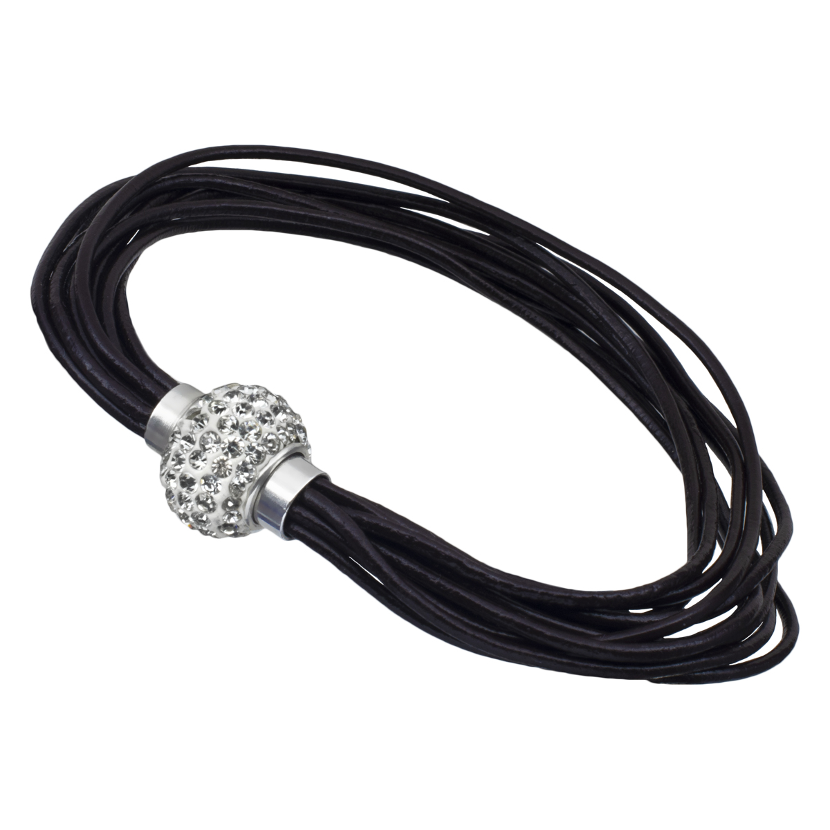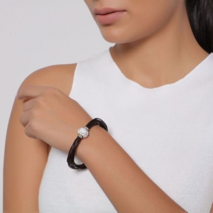 Pulsera de vinipiel, con correa múltiple en color café, detalle de broche magnético e incrustaciones de cristales en color blanco.