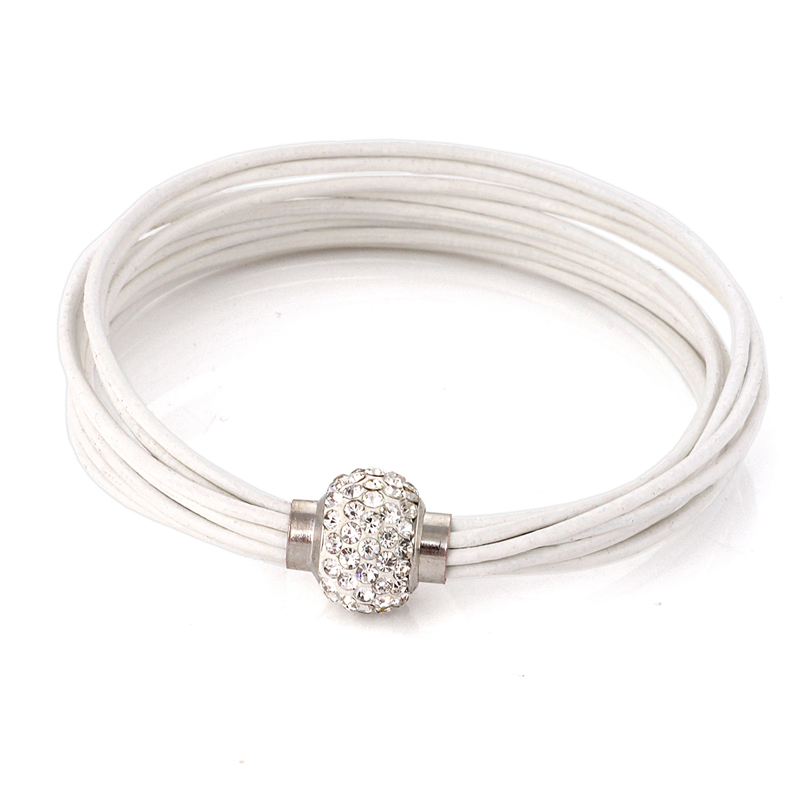 Pulsera de vinipiel, con correa múltiple en color blanco, detalle de broche magnético, con incrustaciones de cristales blancos.