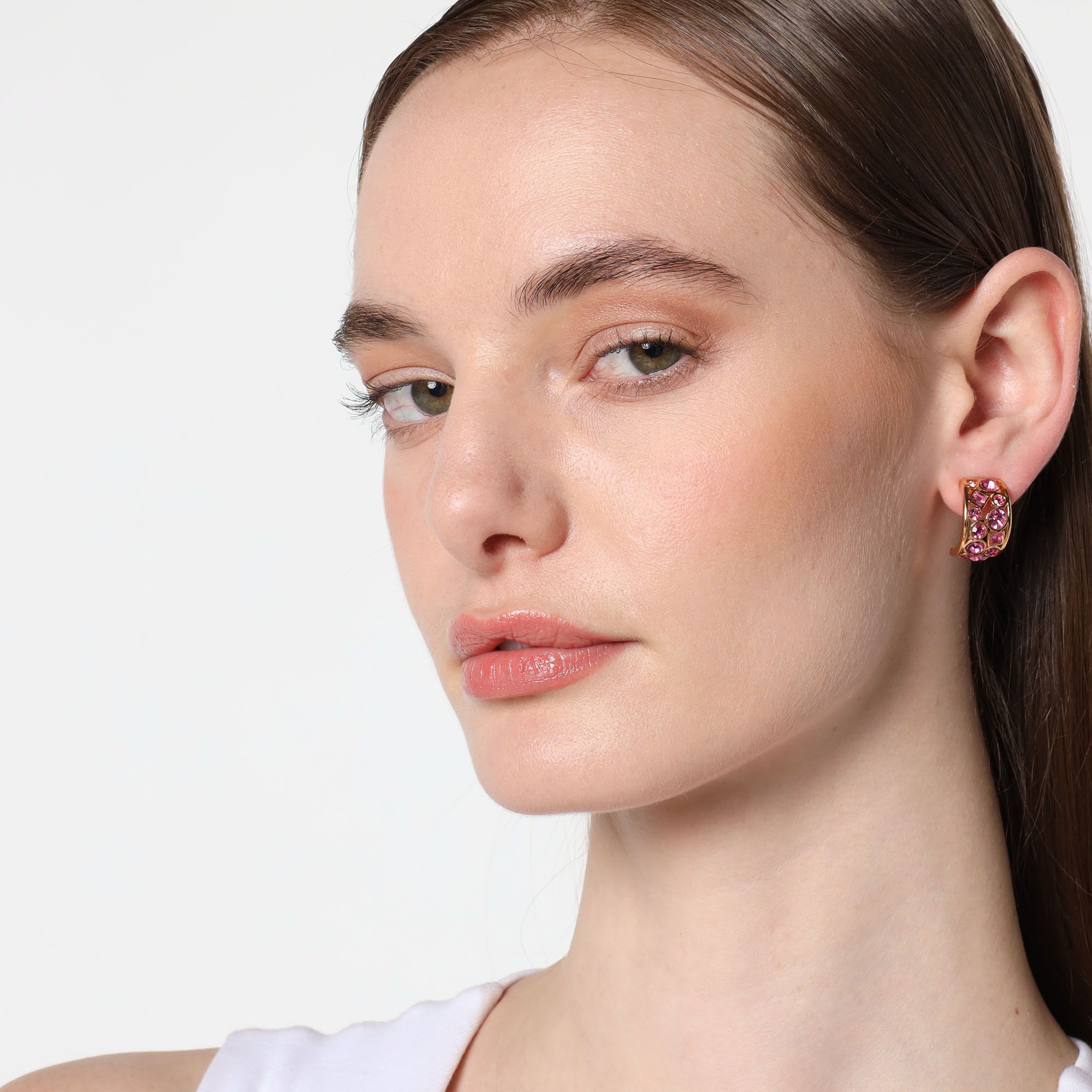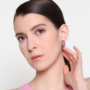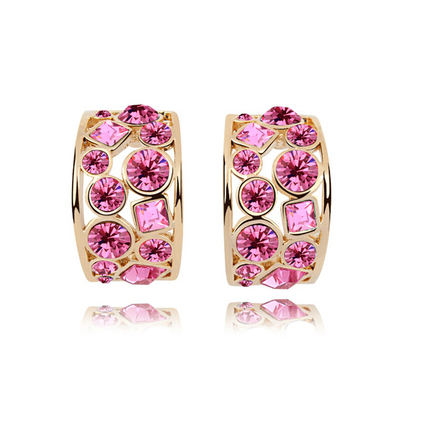 Aretes en baño de oro amarillo de 18 quilates, con cristales en tonos rosa corte princesa y corte brillante.