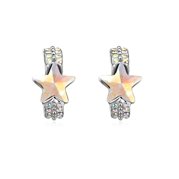 Arracadas en baño de oro blanco de 18 quilates, diseño de estrella en cristal ámbar e incrustaciones de cristales tornasol.