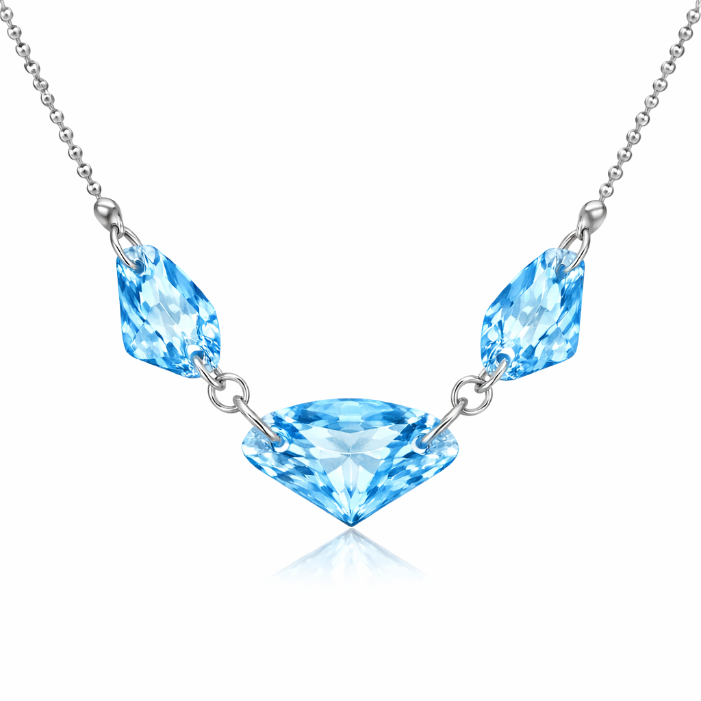 Collar en baño de oro blanco de 18 quilates, fino diseño con cristales azules corte asimétrico.