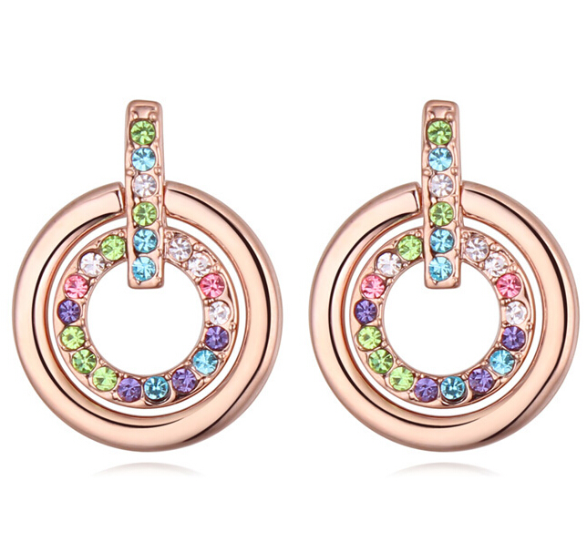 Lindos aretes en baño de oro rosa de 18 quilates, diseño de aros, estilo biselado, con incrustaciones de cristales multicolor.