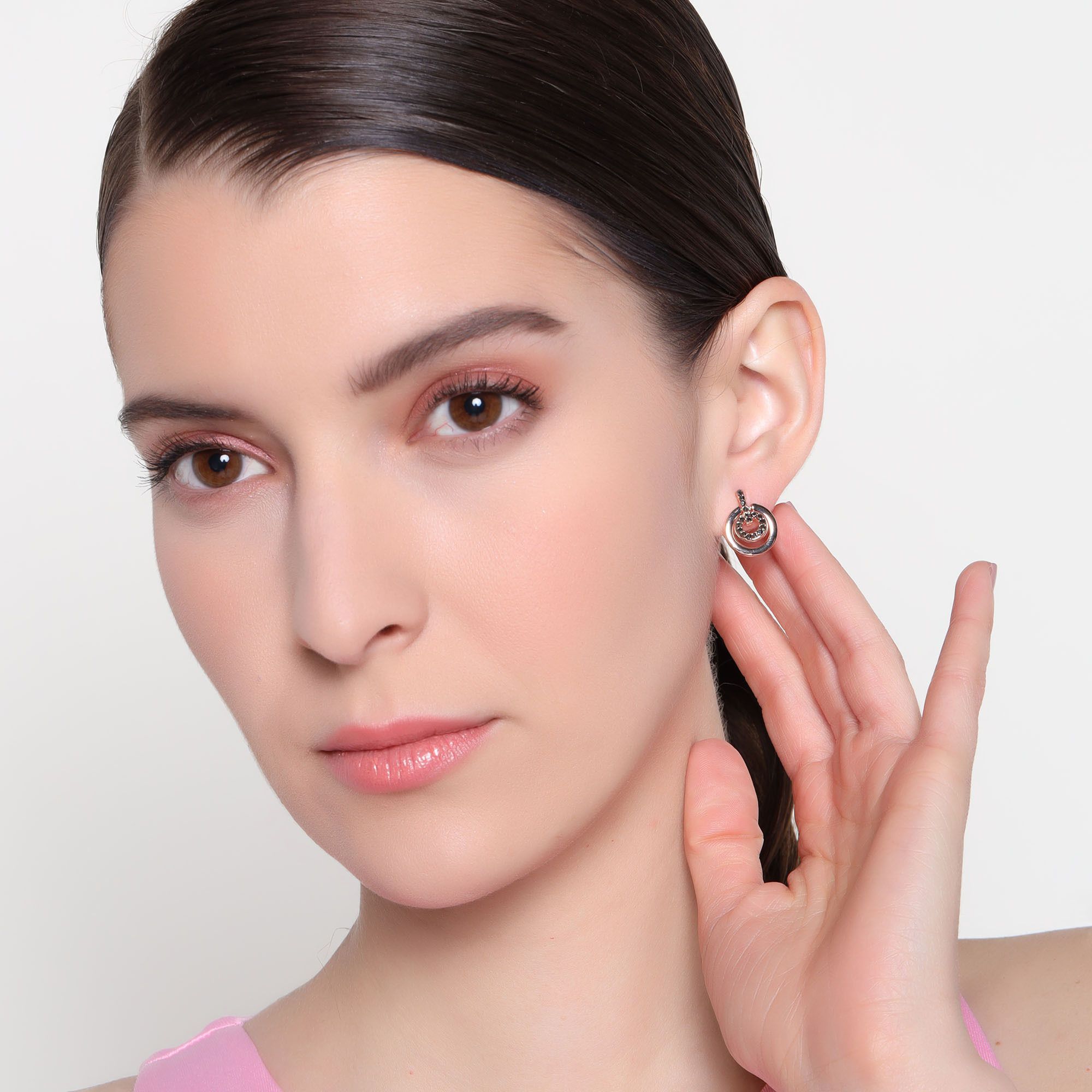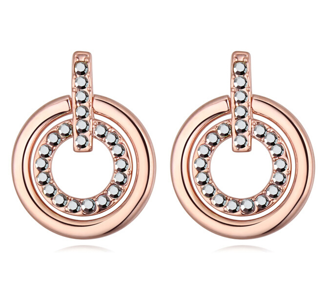 Lindos aretes en baño de oro rosa de 18 quilates, diseño de aros, estilo biselado e incrustaciones de cristales gris oxford.