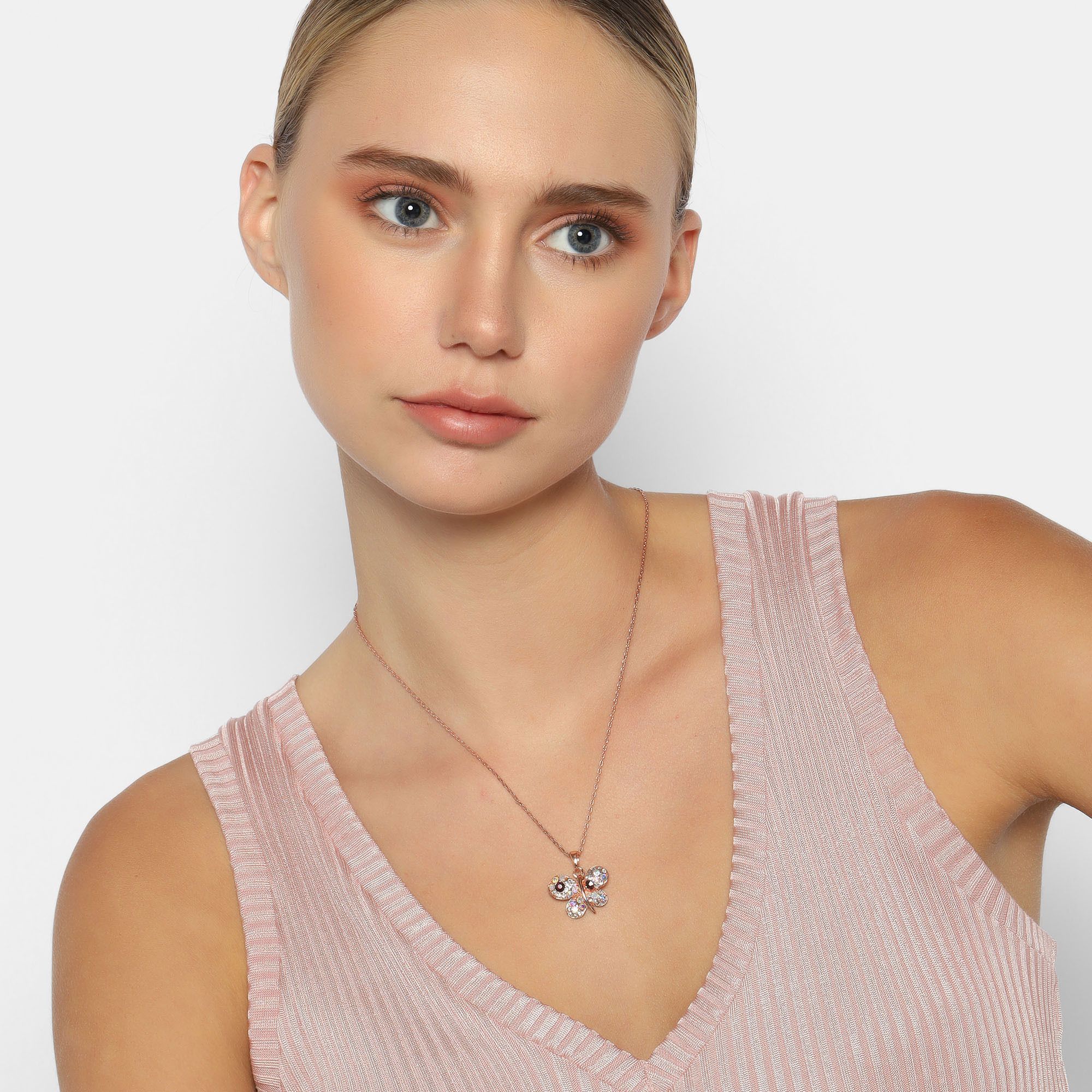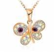 Dije con cadena en baño de oro rosa de 18 quilates, diseño de mariposa con incrustación de cristales en color morado y tornasol. Fabricado en una estructura de aleación de platino con rodio sin níquel 1. joyería Hipoalergénica. 2. Incluye cajita de joyería. 3. Garantía de 30 días por defectos de fabrica.