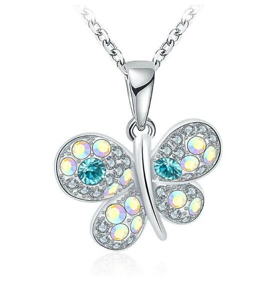 Dije con cadena en baño de oro blanco de 18 quilates, diseño de mariposa con incrustación de cristales en color azul y tornasol. Fabricado en una estructura de aleación de platino con rodio sin níquel 1. joyería Hipoalergénica. 2. Incluye cajita de joyería. 3. Garantía de 30 días por defectos de fabrica.