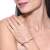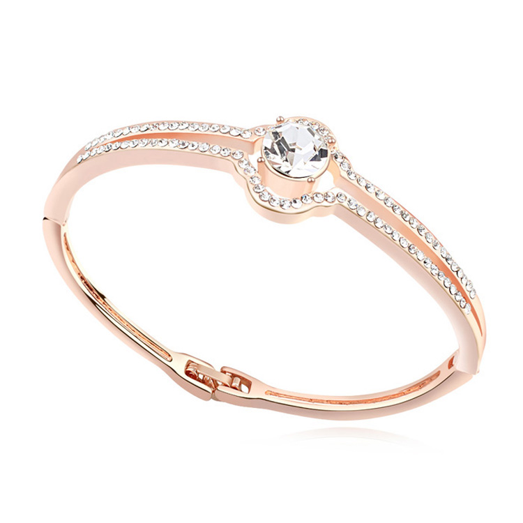 Lindo brazalete, en baño de oro rosa de 18 quilates, fino diseño, con cristal blanco corte brillante e incrustaciones de cristales blancos.