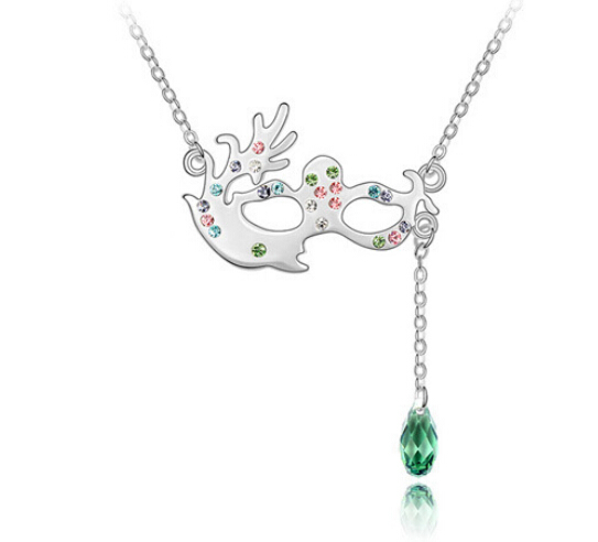 Elegante dije en baño de oro blanco de 18 quilates, diseño de antifaz con cristal verde corte gota, cristales multicolor y blanco.