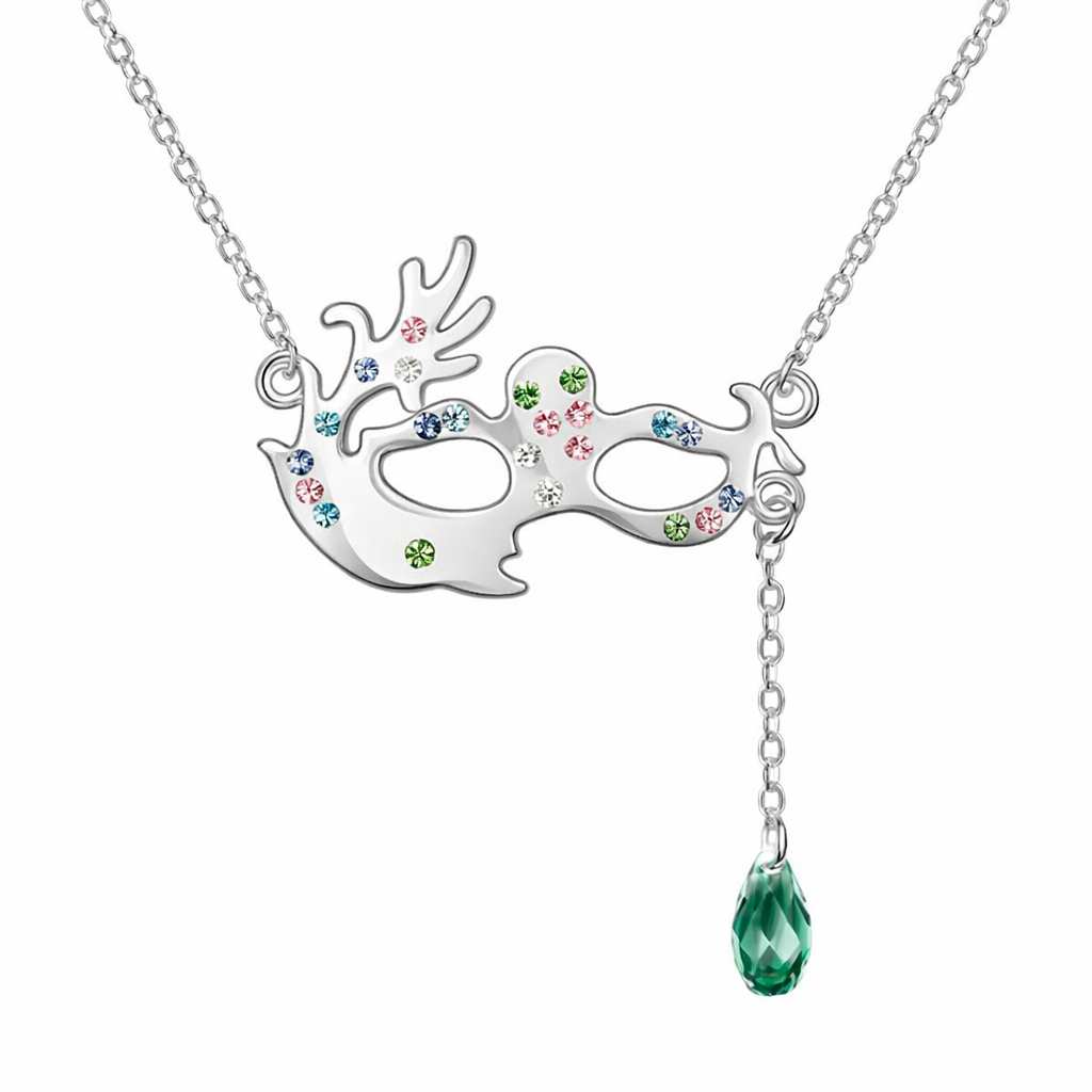 Elegante dije en baño de oro blanco de 18 quilates, diseño de antifaz con cristal verde corte gota, cristales multicolor y blanco.