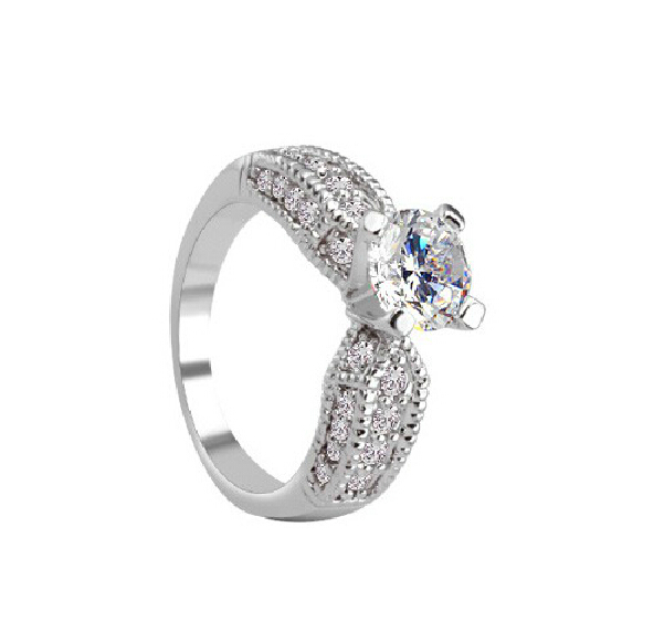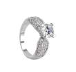 Precioso anillo en baño de oro blanco de 18 quilates, fino diseño, punta de almendra, con cristal blanco corte brillante e incrustaciones de cristales en color blanco.