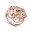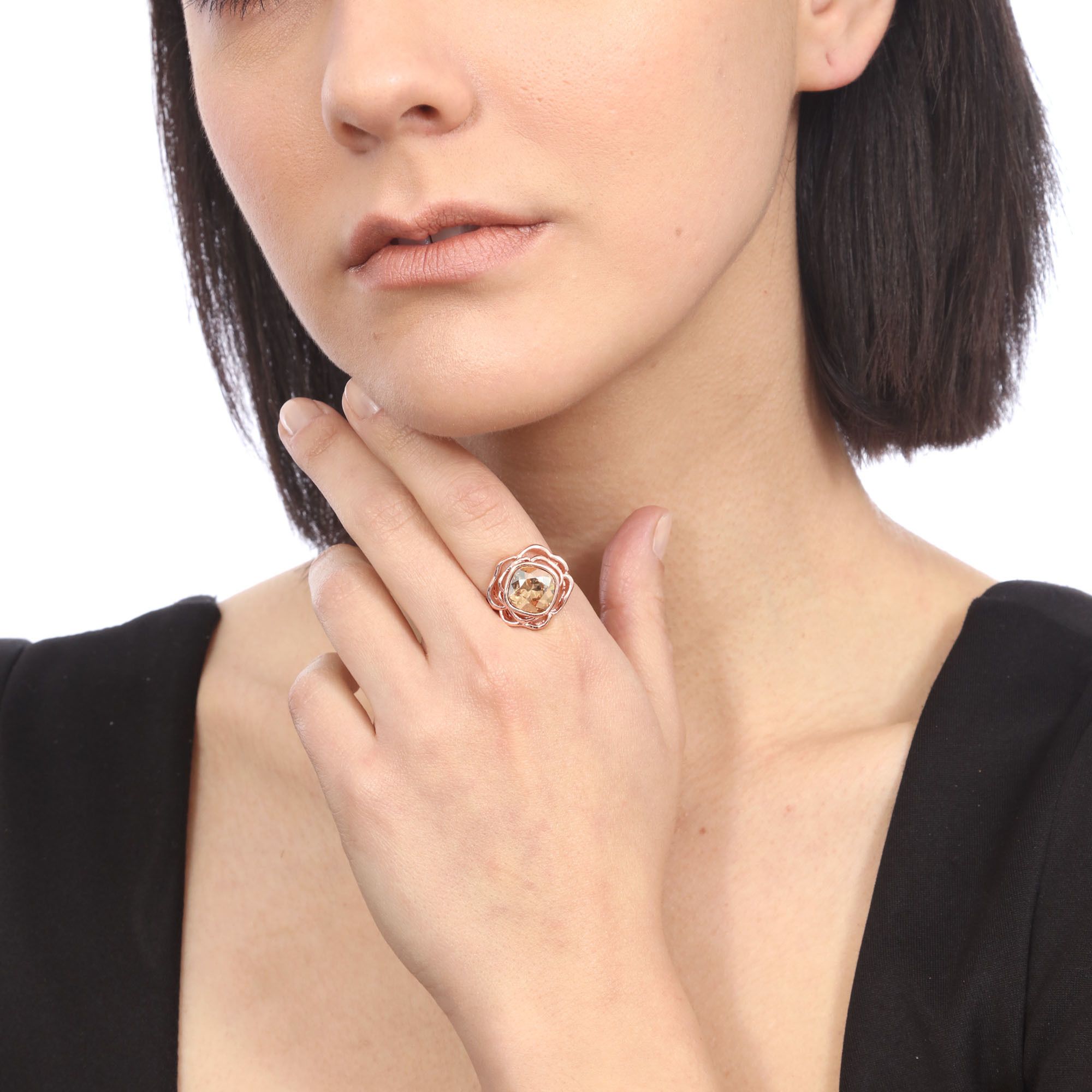 Precioso anillo, en baño de oro rosa de 18 quilates, diseño de rosa, con cristal color ámbar corte cushion.
