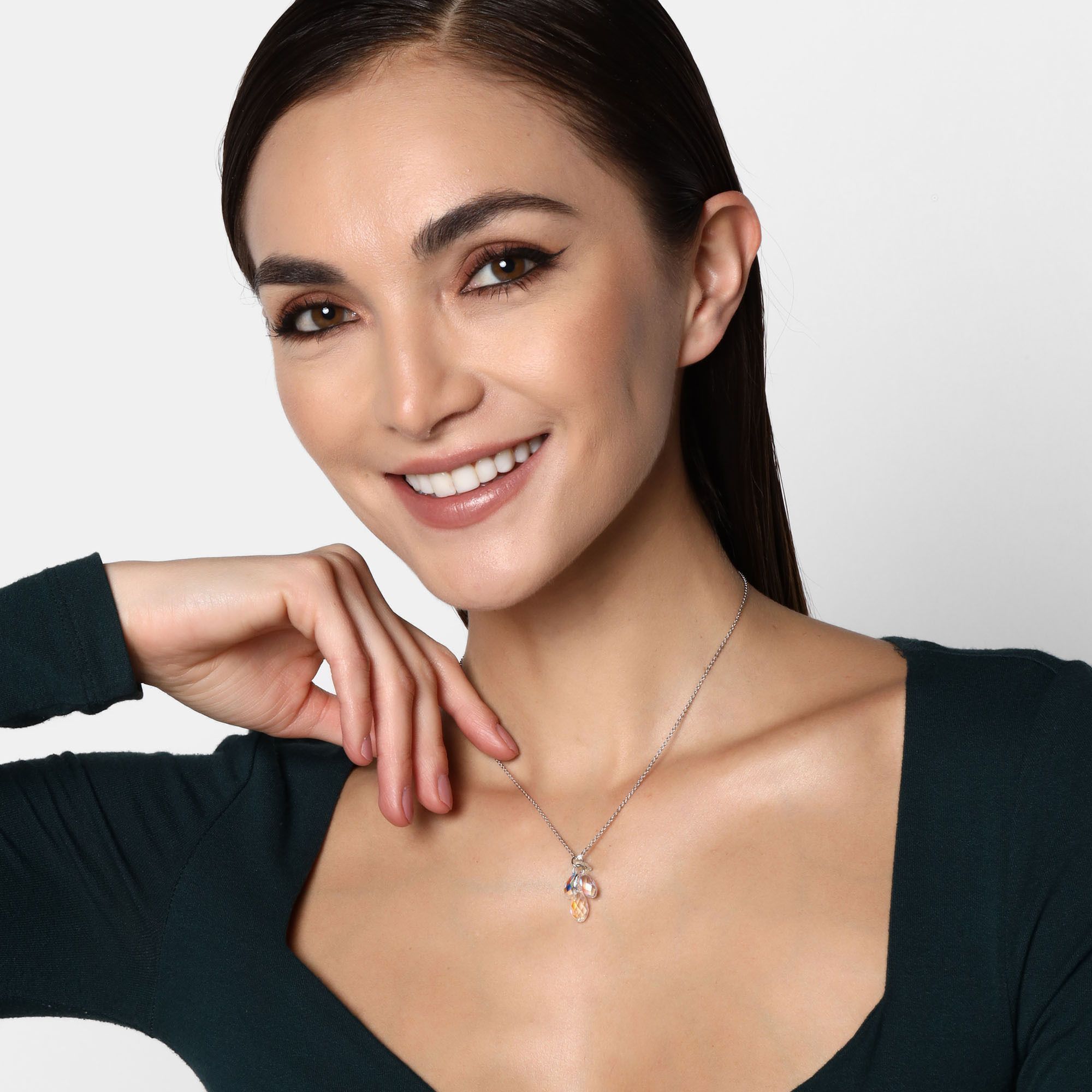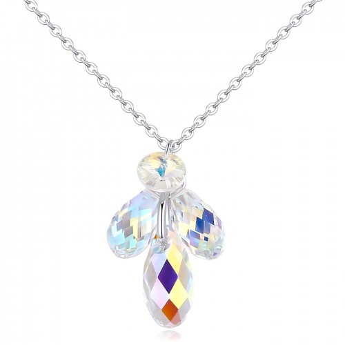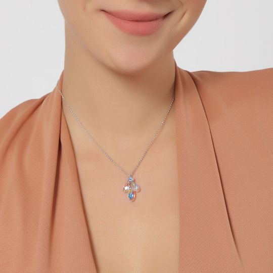 Dije con cadena en baño de oro blanco de 18 quilates, Hermoso diseño con cristales en color tornasol. Fabricado en una estructura de aleación de platino con rodio sin níquel 1. joyería Hipoalergénica. 2. Incluye cajita de joyería. 3. Garantía de 30 días por defectos de fabrica.