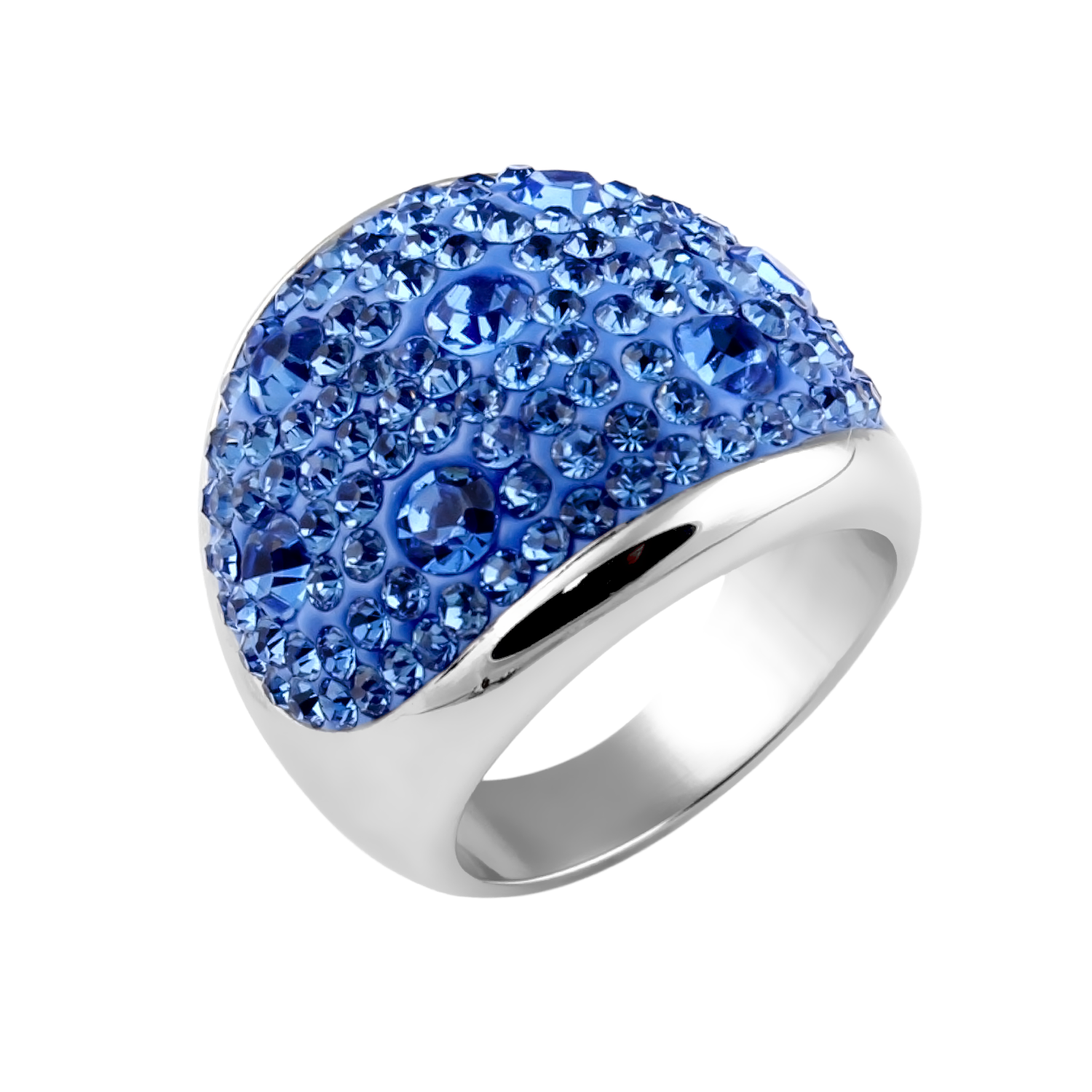 Anillo en baño de oro blanco de 18 quilates, sofisticado diseño convexo, con fondo azul e incrustaciones de cristales en color azul.