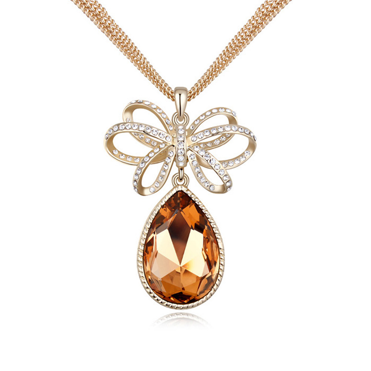 Collar para Sweater en baño de oro amarillo de 18 quilates, diseño con cristales en color blanco y ámbar.
