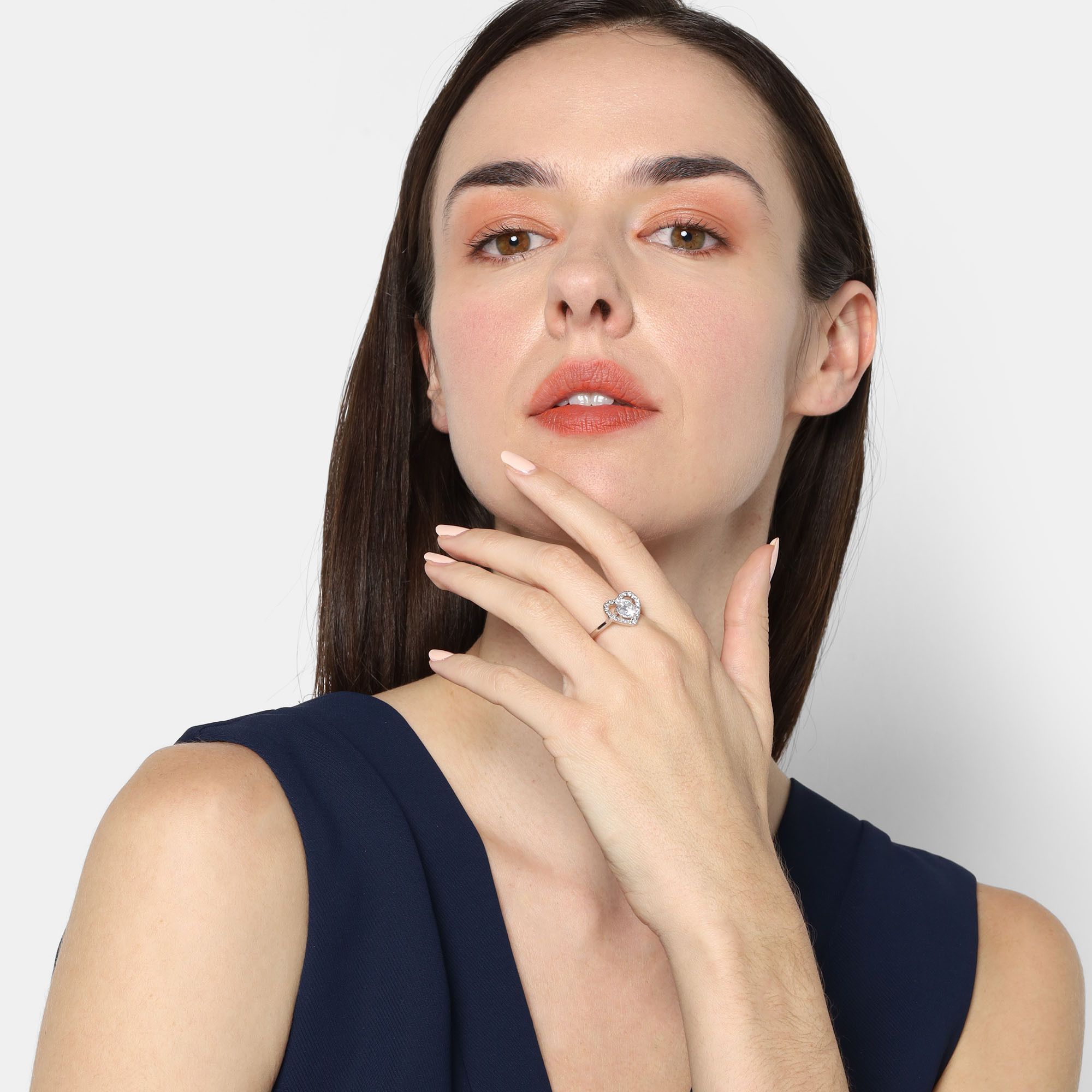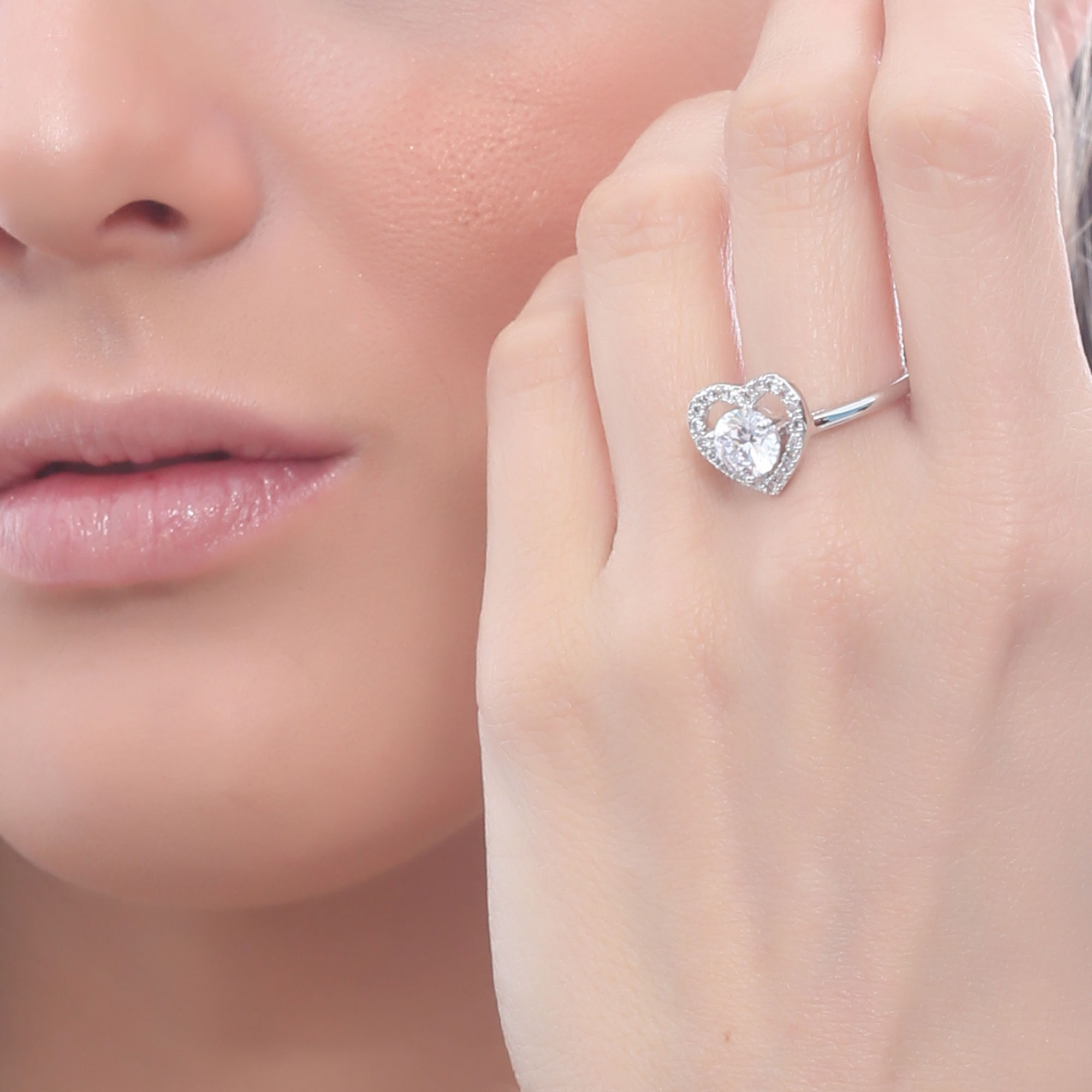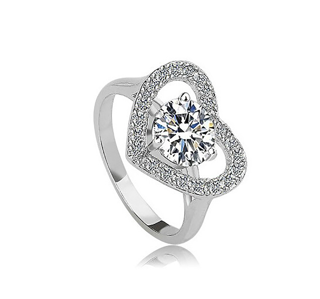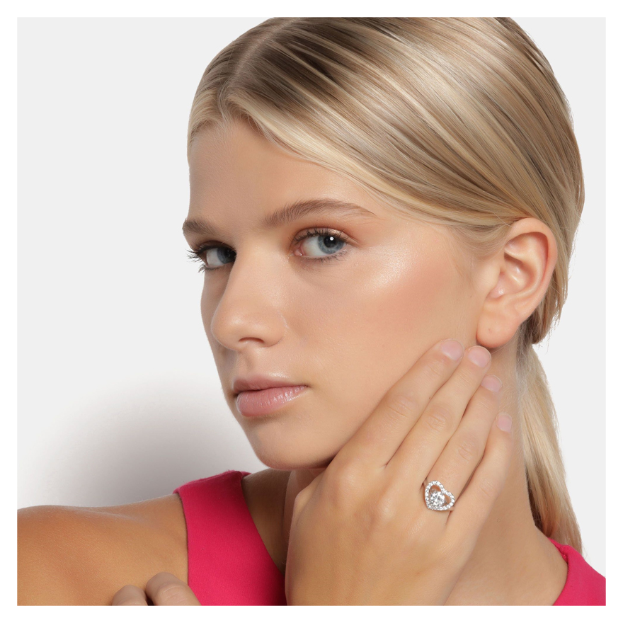 Lindo anillo en baño de oro blanco de 18 quilates, diseño de corazón, con cristal blanco corte brillante e incrustaciones de cristales en color blanco.