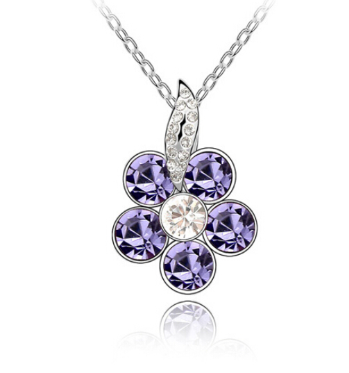 Bonito Dije con cadena en baño de oro blanco de 18 quilates, diseño de flor con incrustación de cristales en color morado. Fabricado en una estructura de aleación de platino con rodio sin níquel 1. joyería Hipoalergénica. 2. Incluye cajita de joyería. 3. Garantía de 30 días por defectos de fabrica.