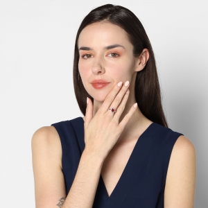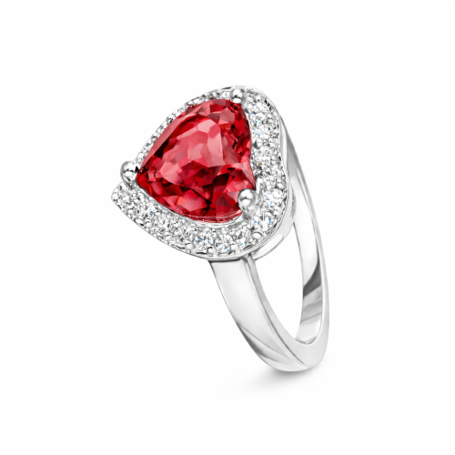 Lindo anillo en baño de oro blanco de 18 quilates, diseño de corazón, con cristal rojo corte corazón e incrustaciones de cristales blancos.