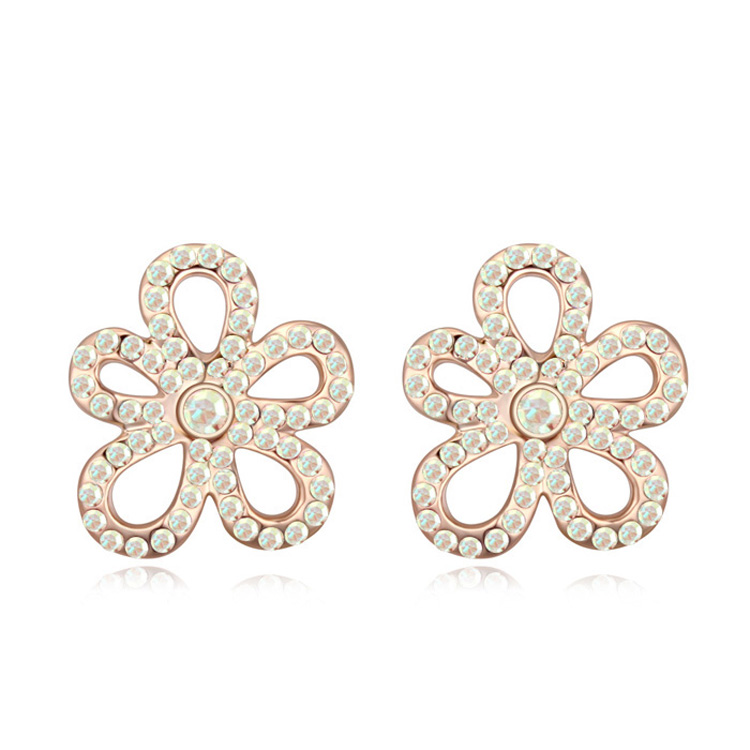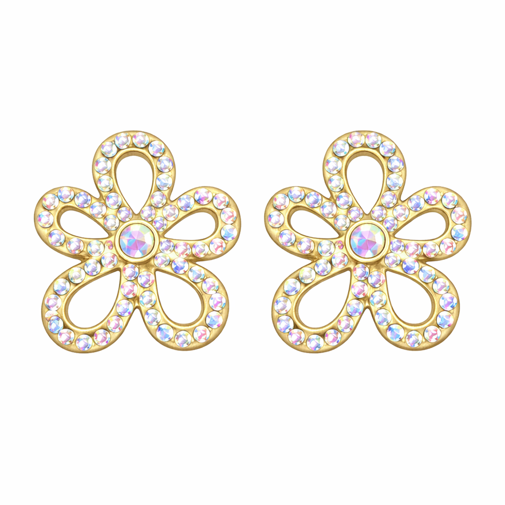 Lindos aretes en baño de oro amarillo de 18 quilates, diseño de flor, con incrustaciones de cristales en color tornasol.