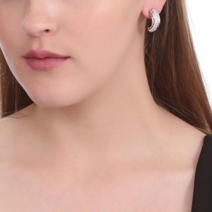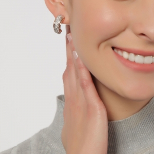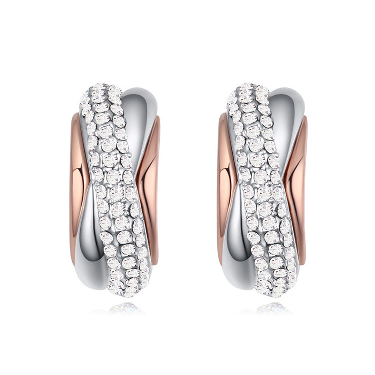 Hermosas arracadas en baño de oro blanco y rosa de 18 quilates, diseño cruzado, con incrustaciones de cristales en color blanco.