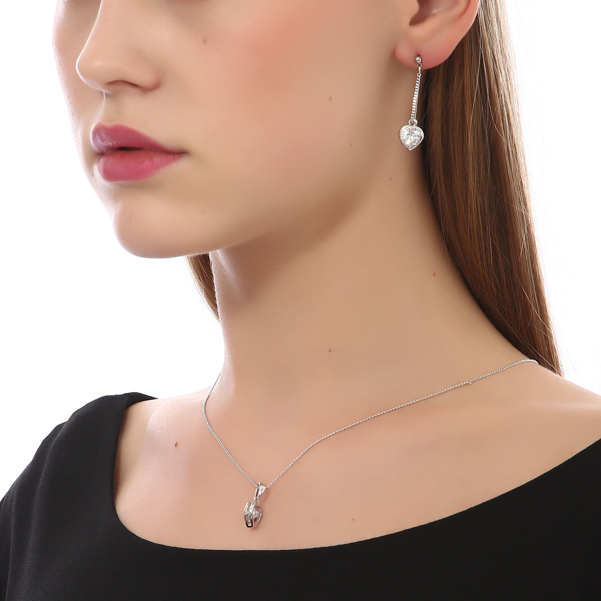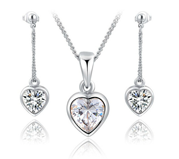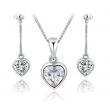 Juego de aretes y dije en baño de oro blanco de 18 quilates, diseño de corazón con incrustación de cristales en color blanco.