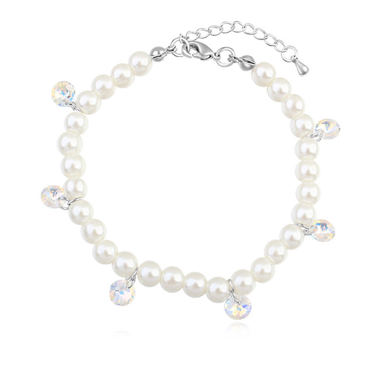 Pulsera con detalles en baño de oro blanco de 18 quilates, bello diseño, con perlas blancas y dijes de cristales blancos.